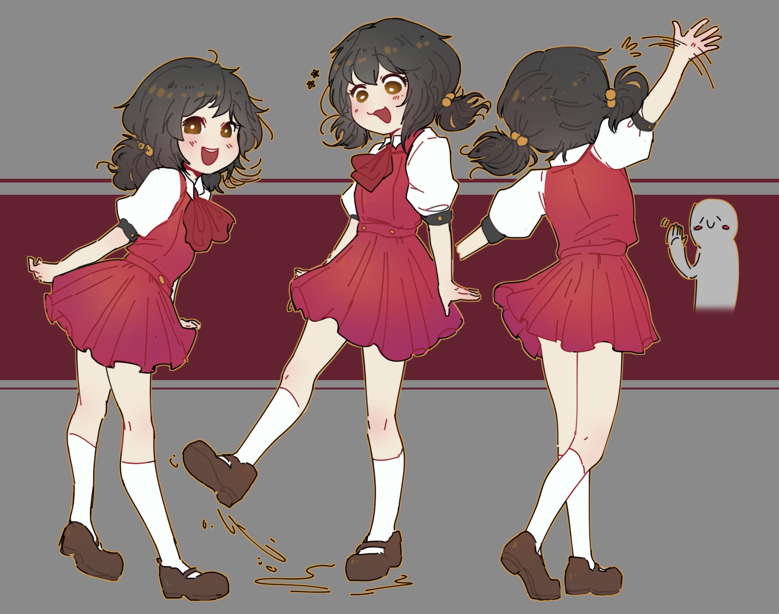 1girl :d ascot black_hair blush brown_eyes brown_shoes dress full_body hair_bobbles hair_ornament highres kaai_yuki looking_at_viewer low_twintails mary_janes medium_hair multiple_views open_mouth outline pinafore_dress pleated_dress puffy_short_sleeves puffy_sleeves red_ascot red_dress school_uniform shirt shoes short_sleeves short_twintails sleeveless sleeveless_dress smile socks tiredcatmom twintails vocaloid waving white_shirt white_socks yellow_outline