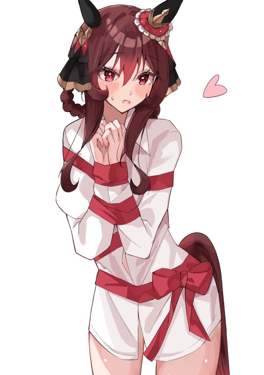 1girl animal_ears black_ribbon blush bound bound_arms bound_wrists bow breasts collared_shirt ear_covers ear_ornament ear_ribbon gentildonna_(umamusume) hands_up heart highres horse_ears horse_girl horse_tail large_breasts long_sleeves open_mouth red_bow ribbon shirt simple_background solo suketoudara_(suketodara) sweatdrop tail thighs umamusume white_background white_shirt