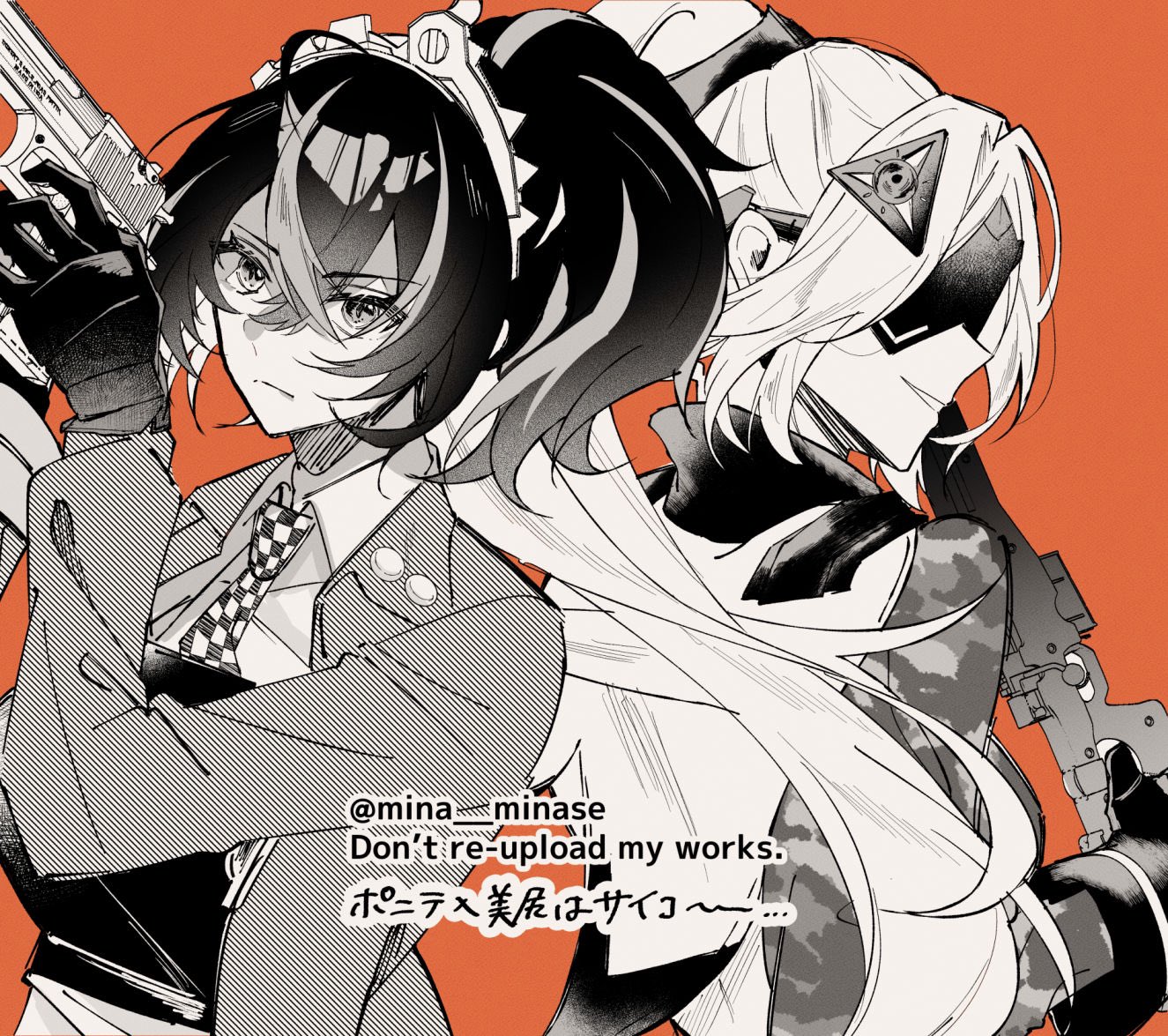 2girls back-to-back blindfold_mask camouflage checkered_necktie covered_eyes gloves greyscale_with_colored_background gun hairband holding holding_gun holding_weapon jacket mask metal_hairband mina_minase multicolored_hair multiple_girls necktie orange_background police police_uniform policewoman ponytail rifle sniper_rifle streaked_hair trigger_(zenless_zone_zero) upper_body weapon zenless_zone_zero zhu_yuan