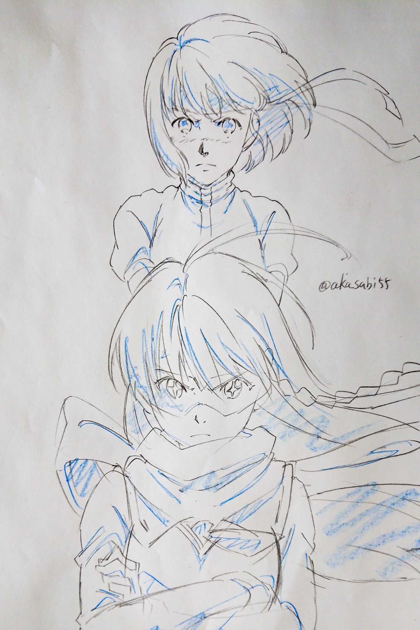2girls ahoge braid closed_mouth cross-shaped_pupils crossed_arms greyscale headband highres long_hair looking_at_viewer matsukawa_tetsuya monochrome multiple_girls nono_(top_wo_nerae_2!) scarf short_hair simple_background symbol-shaped_pupils takaya_noriko top_wo_nerae! top_wo_nerae!_(series) top_wo_nerae_2! twitter_username white_background