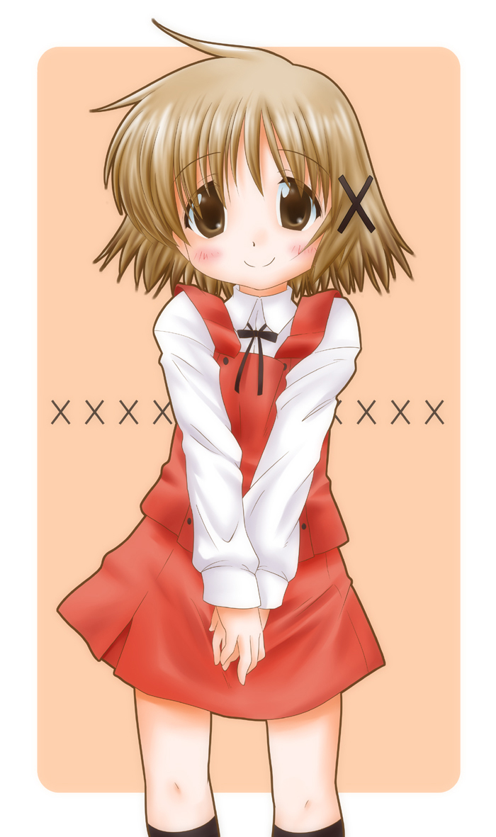 1girl black_socks blush brown_eyes brown_hair closed_mouth facing_viewer feet_out_of_frame female_focus hair_between_eyes hair_ornament hidamari_sketch long_sleeves looking_at_viewer school_uniform shirt short_hair simple_background smile socks solo white_shirt x_hair_ornament yamabuki_high_school_uniform yuno_(hidamari_sketch)