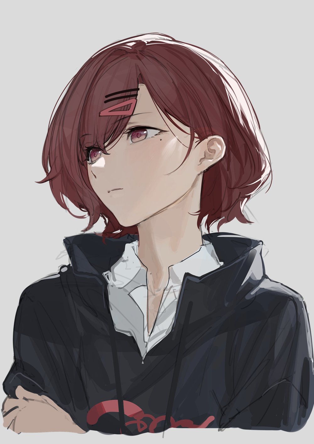 1girl black_jacket brown_eyes brown_hair closed_mouth collared_shirt cropped_torso drawstring grey_background hair_ornament hairclip highres higuchi_madoka idolmaster idolmaster_shiny_colors jacket light_frown looking_to_the_side mole mole_under_eye shirt short_hair simple_background solo white_shirt zhili_xingzou