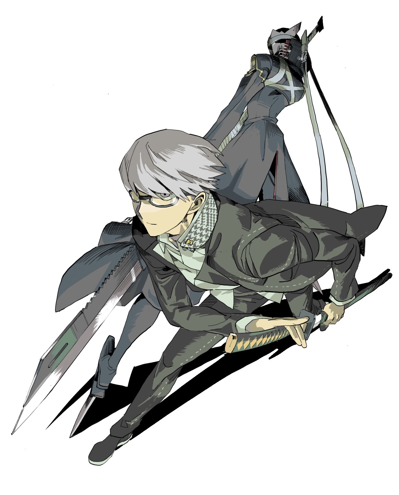1boy black-framed_eyewear black_jacket black_pants closed_mouth collared_shirt full_body glasses grey_hair highres holding holding_sword holding_weapon izanagi_(persona_4) jacket katana long_sleeves looking_at_viewer male_focus narukami_yu open_clothes open_jacket pants persona persona_(summon) persona_4 pure_to_ma school_uniform sheath sheathed shirt short_hair sword weapon white_background white_shirt yasogami_school_uniform