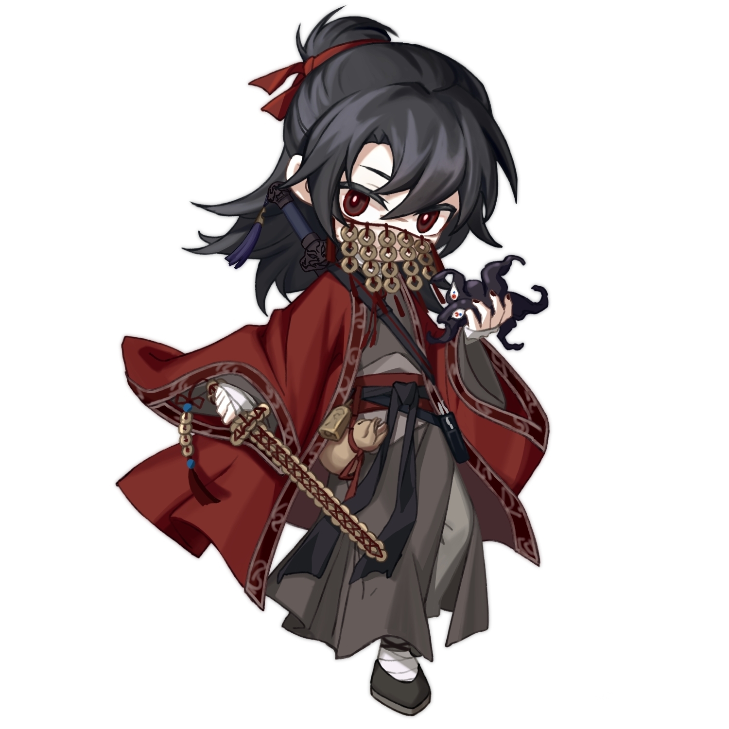 1boy bandages belt bi_xie_jian_(weapon) black_hair black_hanfu black_shoes chibi chibi_only chinese_clothes coat coin covered_mouth dao_gui_yi_xian full_body gourd hair_between_eyes hair_bun hair_ribbon half_updo hanfu highres holding holding_tentacle holding_weapon holed_coin jian_(weapon) jun_buhui li_huowang long_hair long_sleeves looking_at_viewer male_focus mask mouth_veil official_art red_coat red_eyes red_ribbon ribbon robe sash sheath sheathed shoes simple_background single_hair_bun solo standing sword sword_on_back sword_tassel tassel veil weapon weapon_on_back weapon_tassel white_background wide_sleeves