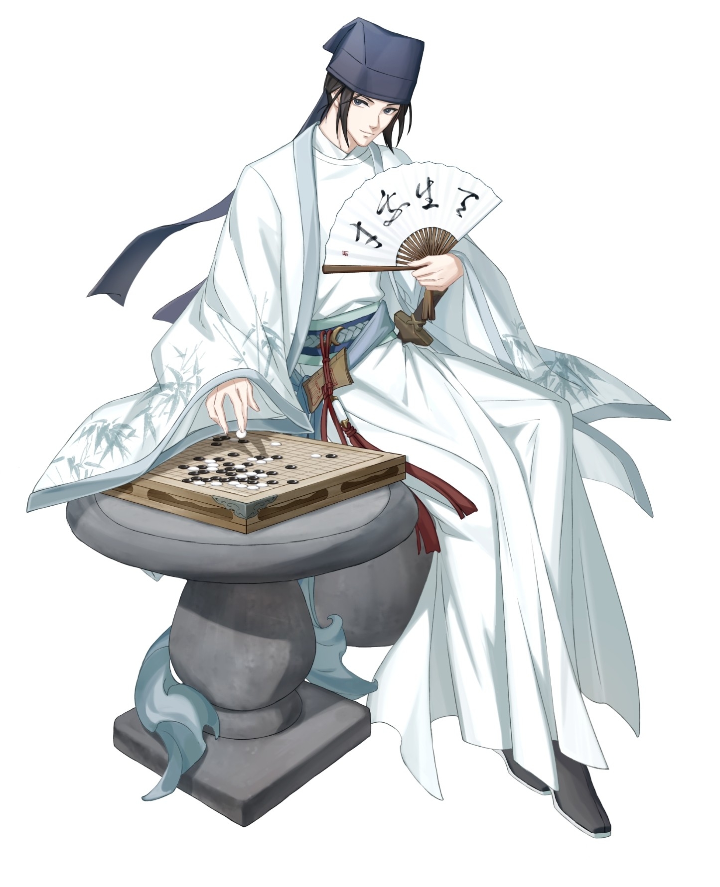 1boy between_fingers black_eyes black_hair black_hat black_shoes board_game chess_piece chinese_clothes closed_mouth dao_gui_yi_xian folding_fan full_body go_(board_game) hand_fan hanfu hat hat_ribbon highres holding holding_chess_piece holding_fan jin_(headwear) jun_buhui long_sleeves looking_at_viewer male_focus official_art paper_fan ribbon robe sash shoes simple_background sitting smile solo sword table tassel weapon white_background white_hanfu white_robe wide_sleeves yaopei zhouzi_jin_(headwear) zhuge_yuan
