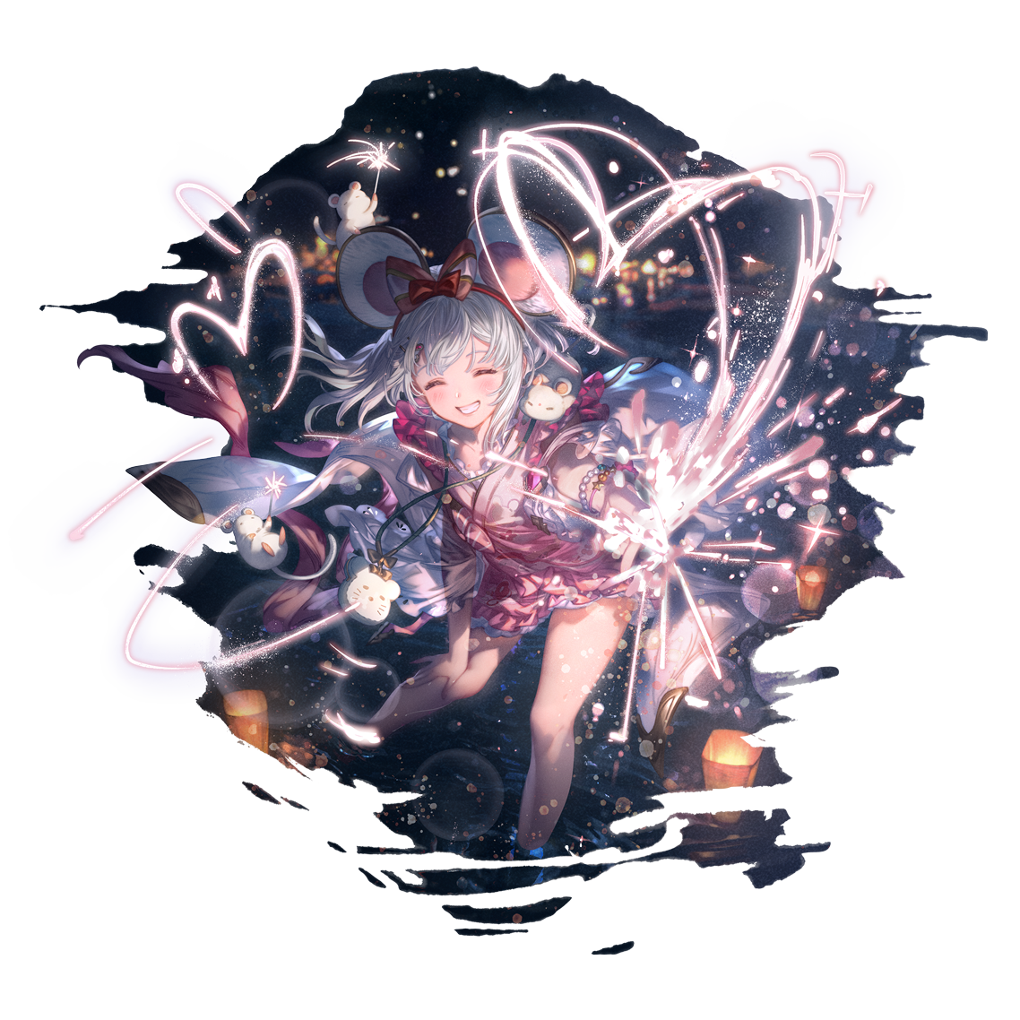 1girl ^_^ animal animal_ears animal_on_shoulder blush closed_eyes granblue_fantasy grin hairband japanese_clothes kimono lantern medium_hair minaba_hideo mouse_ears official_art partially_submerged smile solo sparkle vikala_(granblue_fantasy) vikala_(yukata)_(granblue_fantasy) white_hair yukata