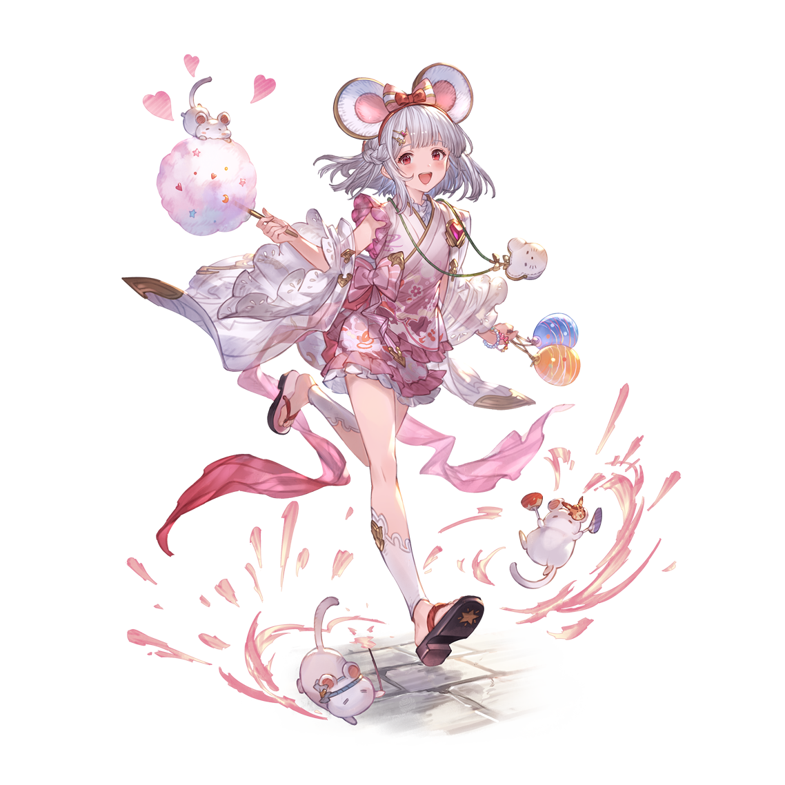 1girl animal_ears blush cotton_candy crescent geta granblue_fantasy hairband hand_fan heart japanese_clothes kimono looking_at_viewer minaba_hideo mouse_ears official_art open_mouth paper_fan red_eyes smile solo star_(symbol) uchiwa vikala_(granblue_fantasy) vikala_(yukata)_(granblue_fantasy) water_yoyo white_hair white_kimono yukata