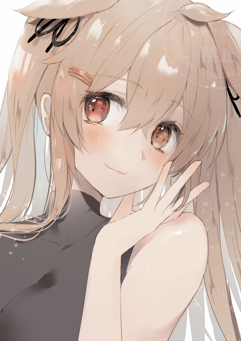 1girl black_shirt brown_eyes brown_hair commission hair_flaps hair_ornament hairclip hatomaru_(hatomaru56) heterochromia kantai_collection long_hair murasame_(kancolle) murasame_kai_ni_(kancolle) red_eyes shirt sleeveless sleeveless_shirt solo turtleneck turtleneck_shirt two_side_up