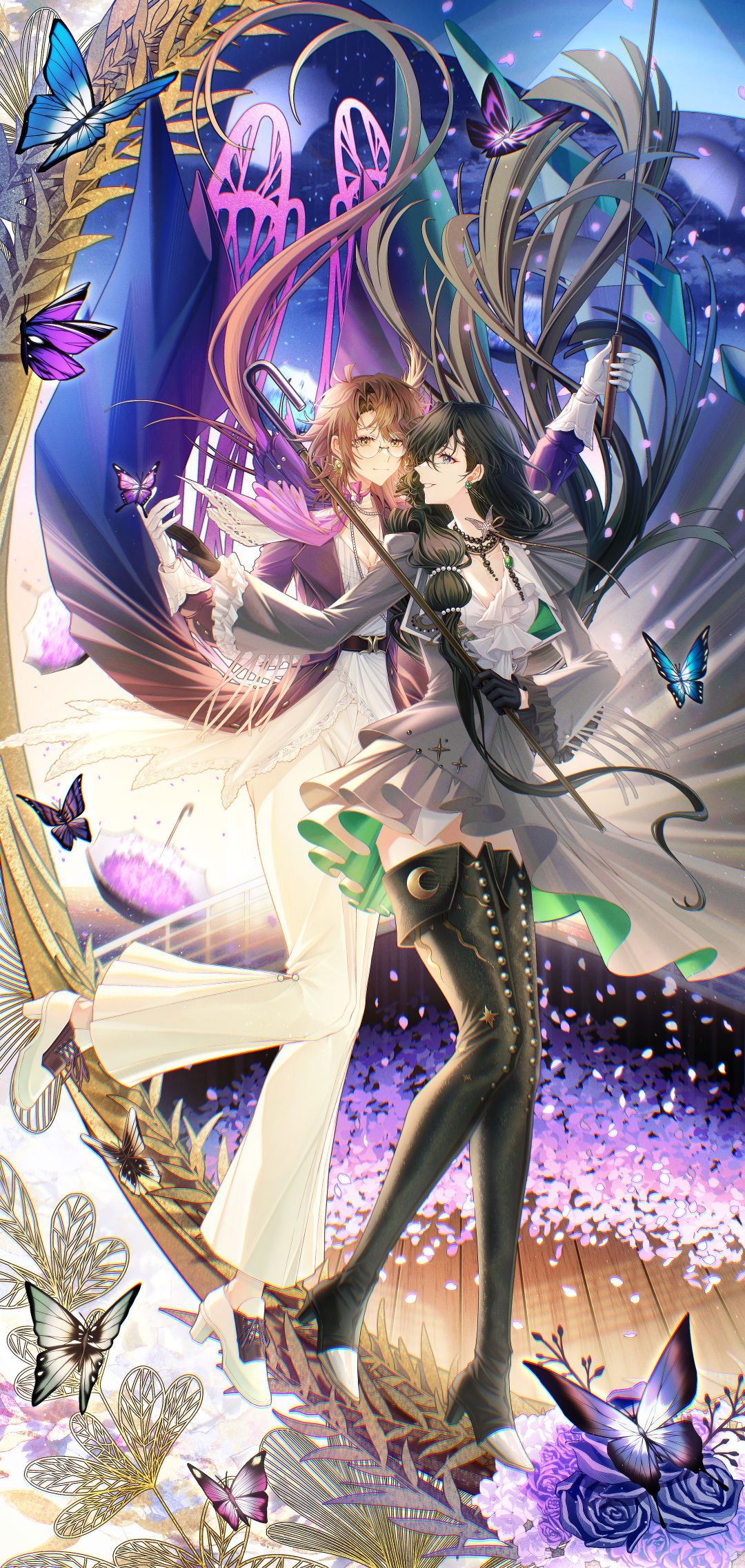 2girls arm_up behind_another black_boots black_gloves black_hair blue_butterfly boots brown_hair bug butterfly cane coat earrings floating_hair flower fold-over_boots full_body gloves green_butterfly grey_jacket grey_skirt grin hands_up high-low_skirt high_heels highres holding holding_cane holding_umbrella insect isolde_(and_all_that_jazz)_(reverse:1999) isolde_(reverse:1999) jacket jewelry kakania_(reverse:1999) kakania_(seminars_on_serenity)_(reverse:1999) leg_up long_hair long_sleeves looking_at_another multiple_girls neckerchief official_alternate_costume pants profile purple_butterfly purple_coat purple_eyes purple_flower purple_neckerchief purple_rose reverse:1999 rose shirt shoes sieka_(piiroinardesco) skirt smile standing standing_on_one_leg thigh_boots turning_head umbrella very_long_hair white_gloves white_pants white_shirt white_shoes