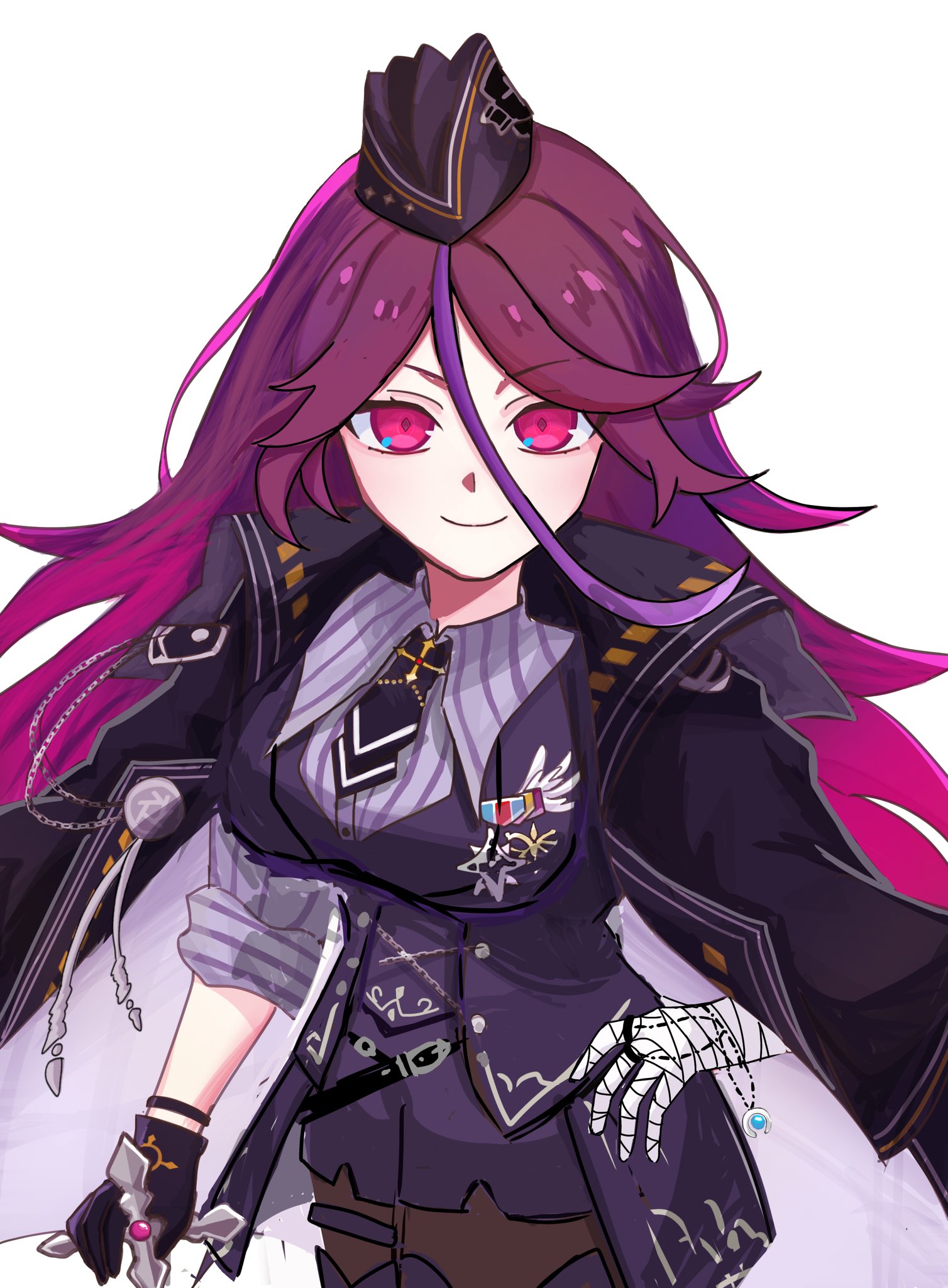 1girl bandaged_hand bandages honkai_gakuen black_gloves black_hat black_jacket closed_mouth commentary_request cowboy_shot gloves hair_between_eyes hand_on_own_hip hat highres honkai_(series) houraiji_kyuushou jacket long_hair long_hair_between_eyes purple_eyes purple_hair shirt single_glove smile solo striped_clothes striped_shirt vertical-striped_clothes vertical-striped_shirt vlh3tu