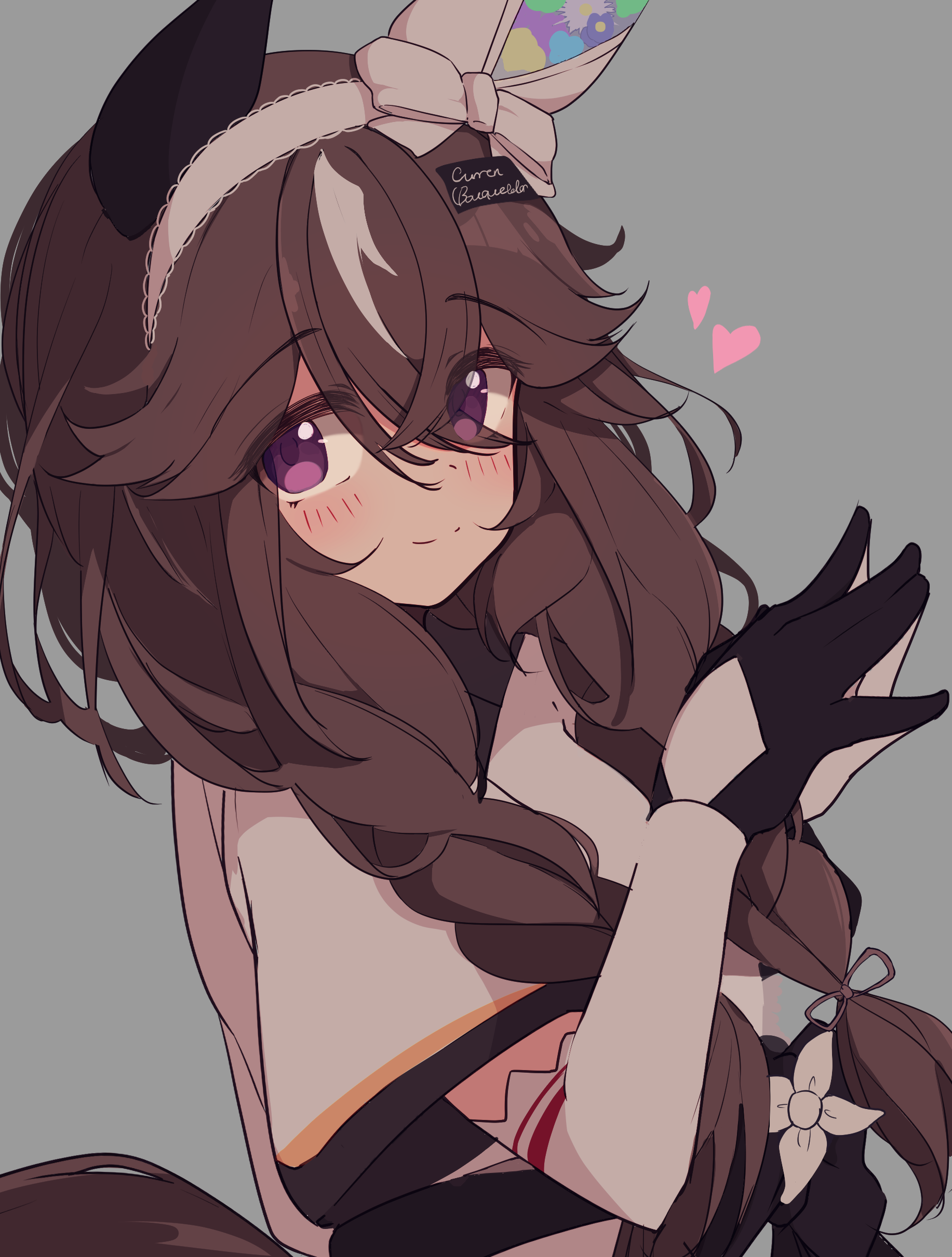 1girl absurdres animal_ears braid curren_bouquetd'or_(umamusume) gloves grey_background grey_hair hair_between_eyes hair_ornament hairband heart highres horse_ears horse_girl long_braid looking_at_viewer low_twin_braids mountain_yasan own_hands_together portrait purple_eyes simple_background smile twin_braids umamusume