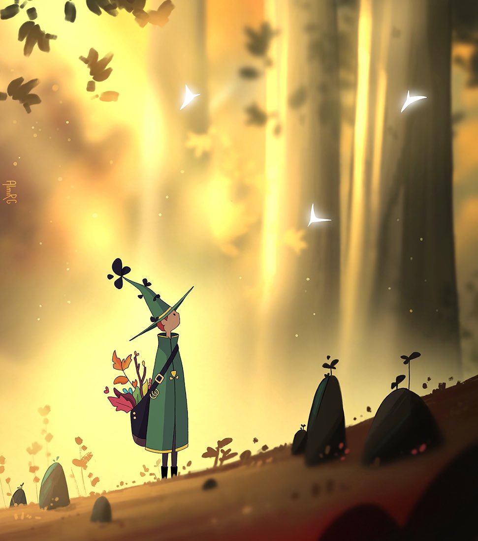 1boy almirgusic autumn autumn_leaves bag boots cloak facing_to_the_side forest full_body green_cloak green_hat hat leaf male_focus nature open_bag orange_hair original outdoors plant short_hair shoulder_bag solo standing tree wizard wizard_hat