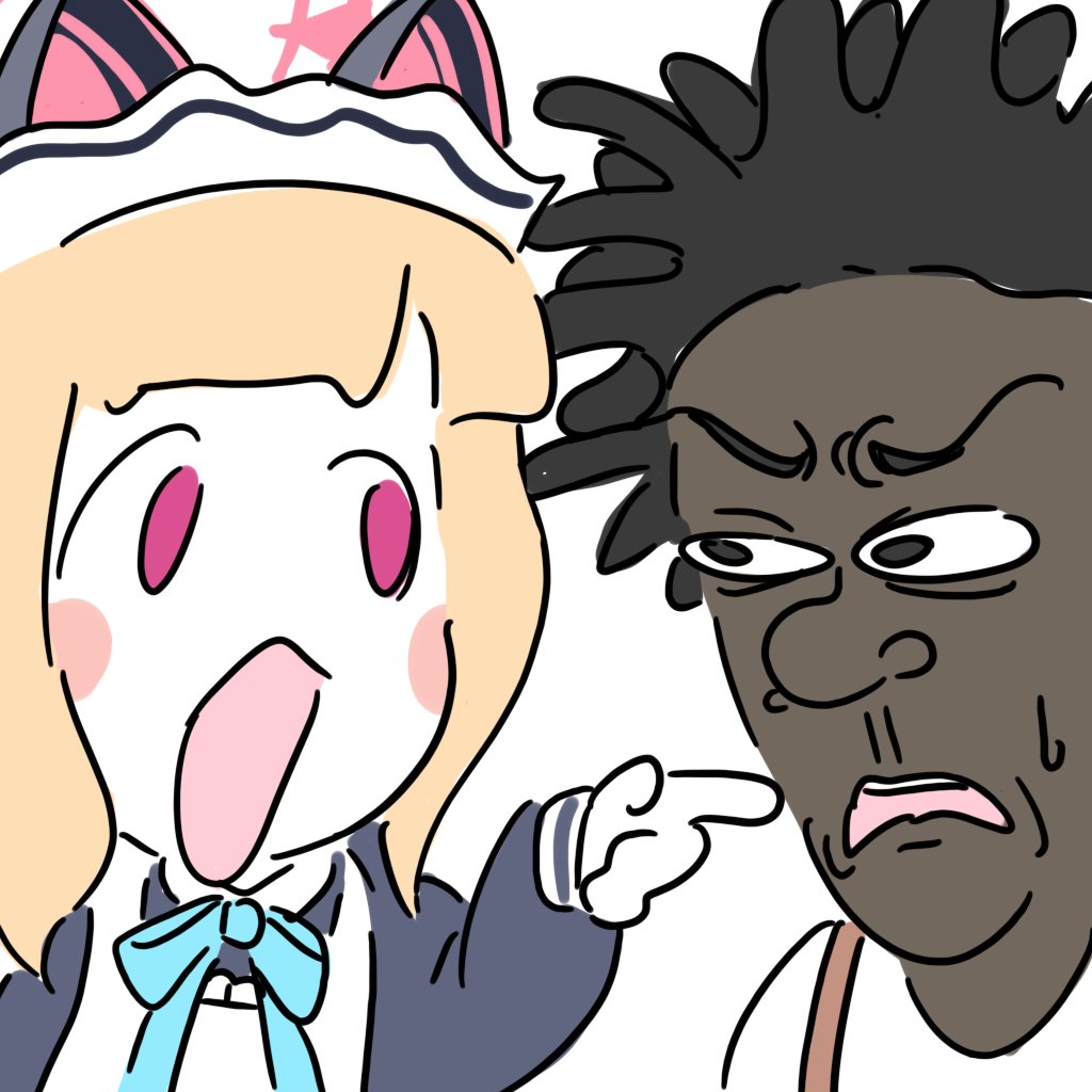 1boy 1girl animal_ear_headphones animal_ears apron blonde_hair blue_archive blush_stickers dark-skinned_male dark_skin fake_animal_ears halo headphones ishowspeed long_sleeves maid maid_apron maid_headdress meme momoi_(blue_archive) momoi_(maid)_(blue_archive) official_alternate_costume open_mouth pink_halo pointing pointing_at_another qb_(drawingsomething2015) racist_momoi_(meme) sweatdrop upper_body white_apron