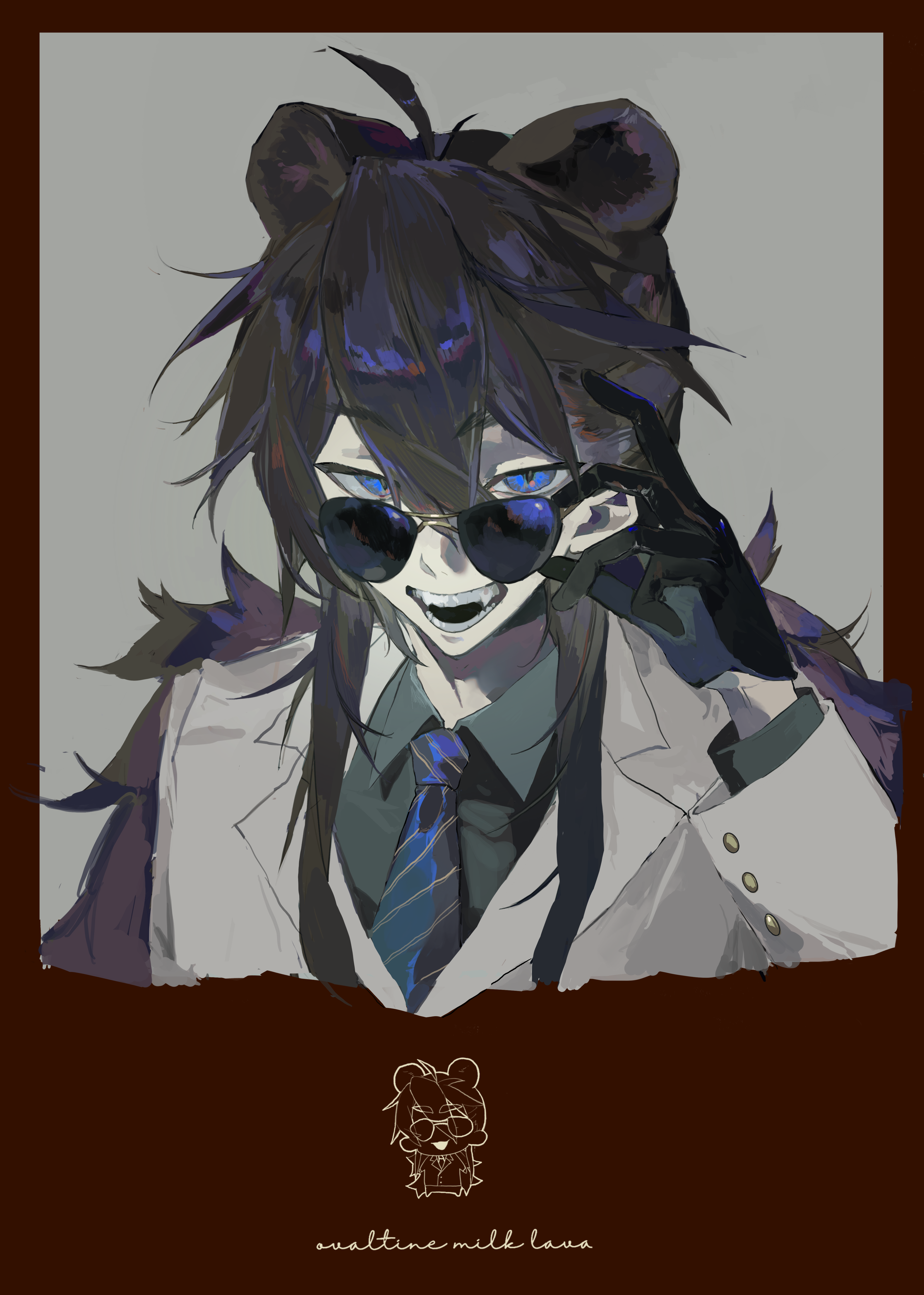 1boy absurdres adjusting_eyewear ahoge animal_ears bear_ears black_gloves black_hair blue_eyes blue_necktie buttons chibi chinese_commentary collared_shirt commentary_request diagonal-striped_clothes diagonal-striped_necktie fangs gloves green_shirt grey_jacket hair_between_eyes highres jacket kuma_(yoooooooo152) lapels long_hair long_sleeves male_focus multiple_views necktie notched_lapels open_mouth original shirt sidelocks smile striped_clothes sunglasses