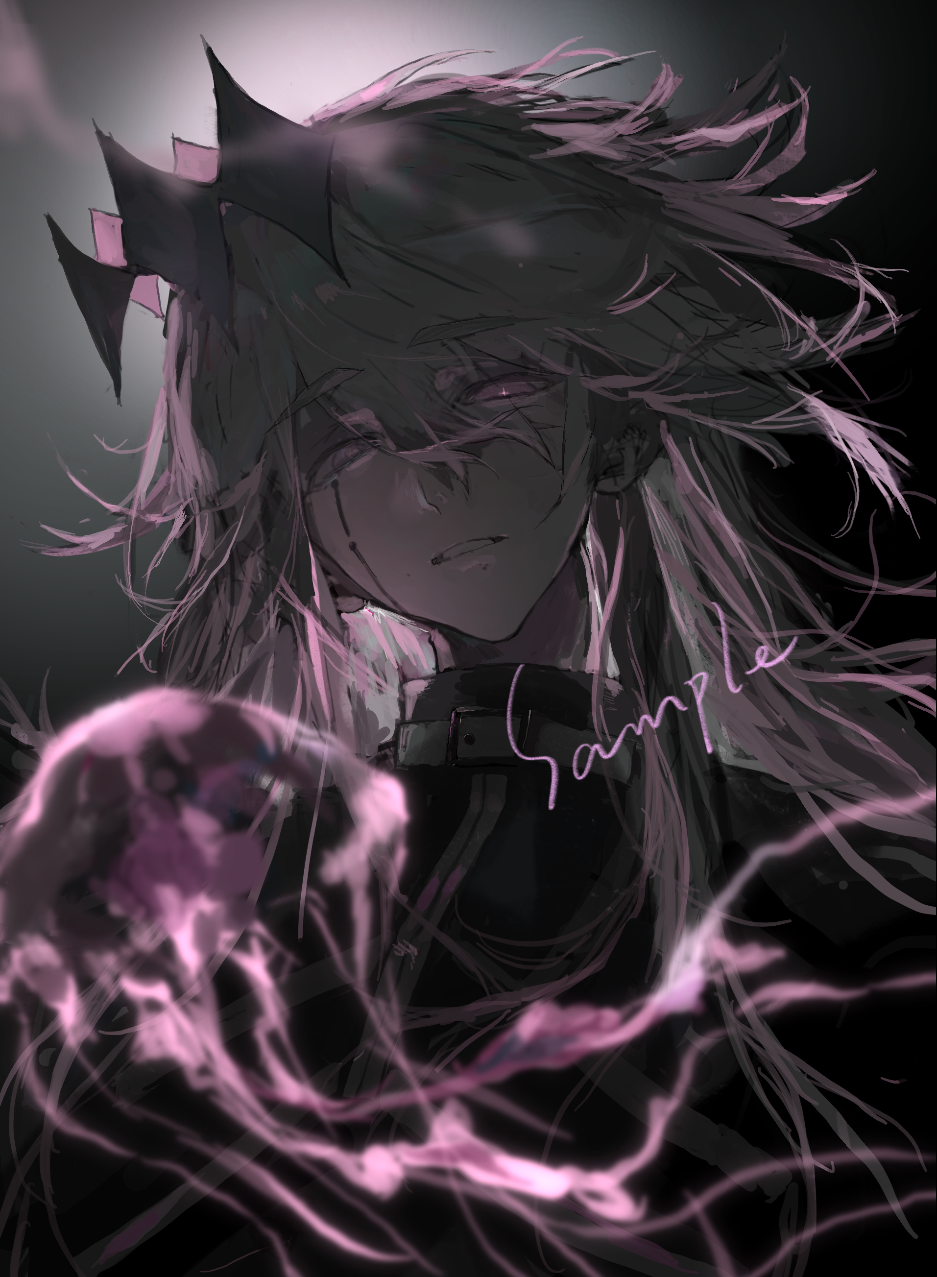 1girl absurdres black_background blurry blurry_foreground buckle commentary_request greyscale hair_between_eyes highres jacket jellyfish kuma_(yoooooooo152) long_hair looking_at_viewer monochrome original pink_eyes sample_watermark solo spot_color upper_body watermark