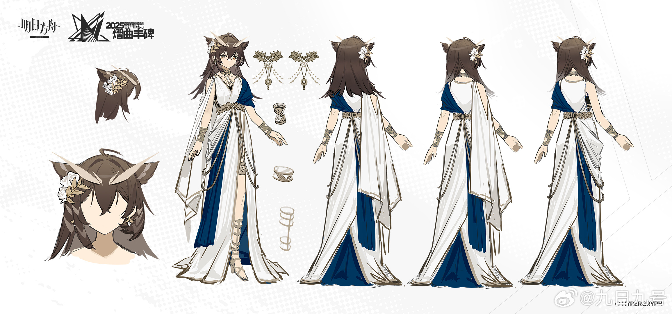 1girl ahoge ambience_synesthesia arknights artist_name bracelet brown_hair chinese_commentary commentary_request concept_art copyright_name flower from_behind green_eyes hair_flower hair_ornament high_heels highres jewelry jiuri_jiuhao looking_at_viewer medium_hair multicolored_robe multiple_views necklace official_art owl_ears owl_girl purple_robe reference_sheet robe sidelocks silence_(arknights) silence_the_paradigmatic_(arknights) white_flower white_robe