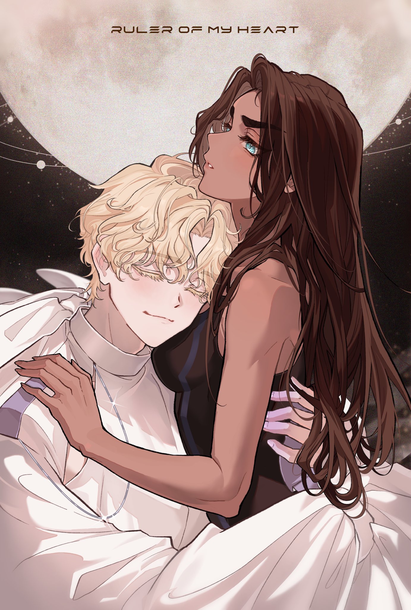 1boy 1girl alien_stage black_tank_top brown_hair closed_eyes colored_eyelashes commentary_request dark-skinned_female dark_skin english_text grey_eyes hand_on_another's_shoulder highres hug hyuna_(alien_stage) lolo_(myon_creative) long_hair long_sleeves luka_(alien_stage) moon shirt short_hair smile song_name tank_top white_shirt