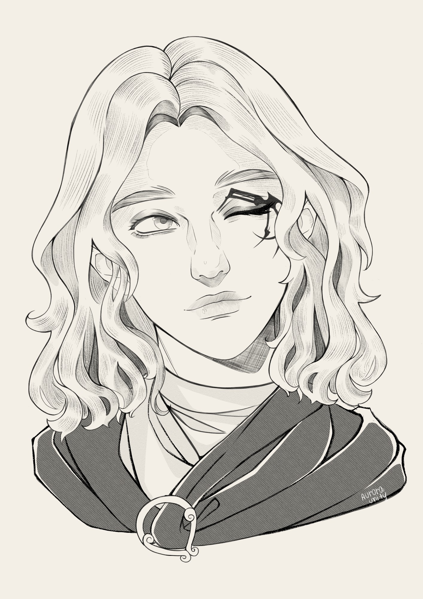 1girl aurora_unity black_cloak cloak elden_ring facial_mark highres hood hooded_cloak lips looking_to_the_side medium_hair melina_(elden_ring) one_eye_closed portrait sketch smile