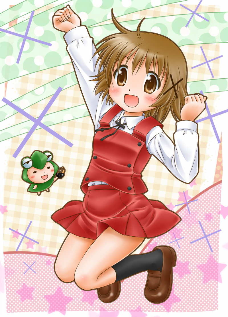 1girl 1other arm_up black_socks blush brown_eyes brown_hair dot_nose full_body hair_ornament hidamari_sketch holding legs long_sleeves open_mouth school_uniform shirt short_hair socks ume-sensei white_shirt x_hair_ornament yamabuki_high_school_uniform yuno_(hidamari_sketch)