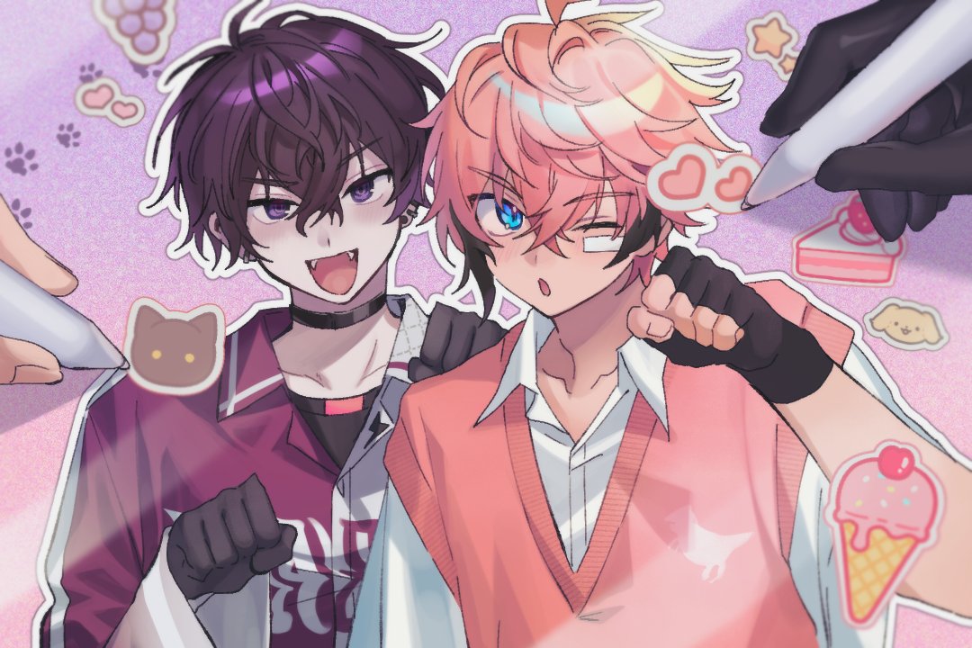 2boys :d ;o ahoge akagi_wen akagi_wen_(1st_costume) antenna_hair bandaid bandaid_on_cheek bandaid_on_face black_choker black_gloves black_hair blue_eyes blush cake cake_slice cherry choker collarbone collared_shirt commentary creepyday crossed_bangs ear_piercing earrings fangs fingerless_gloves food fruit gloves grapes hair_between_eyes hand_up hands_up heart holding holding_pen ice_cream ice_cream_cone jewelry long_sleeves looking_at_viewer male_focus multicolored_hair multiple_boys nijisanji one_eye_closed open_mouth outline paw_pose paw_print pen piercing pink_hair pink_sweater_vest print_shirt purple_background purple_eyes purple_hair purple_shirt saiki_ittetsu saiki_ittetsu_(1st_costume) shirt short_hair short_sleeves sleeveless sleeveless_shirt smile star_(symbol) strawberry streaked_hair sweater_vest untranslatable_commentary two-tone_shirt undershirt upper_body v-shaped_eyebrows virtual_youtuber white_outline white_shirt wide_hips