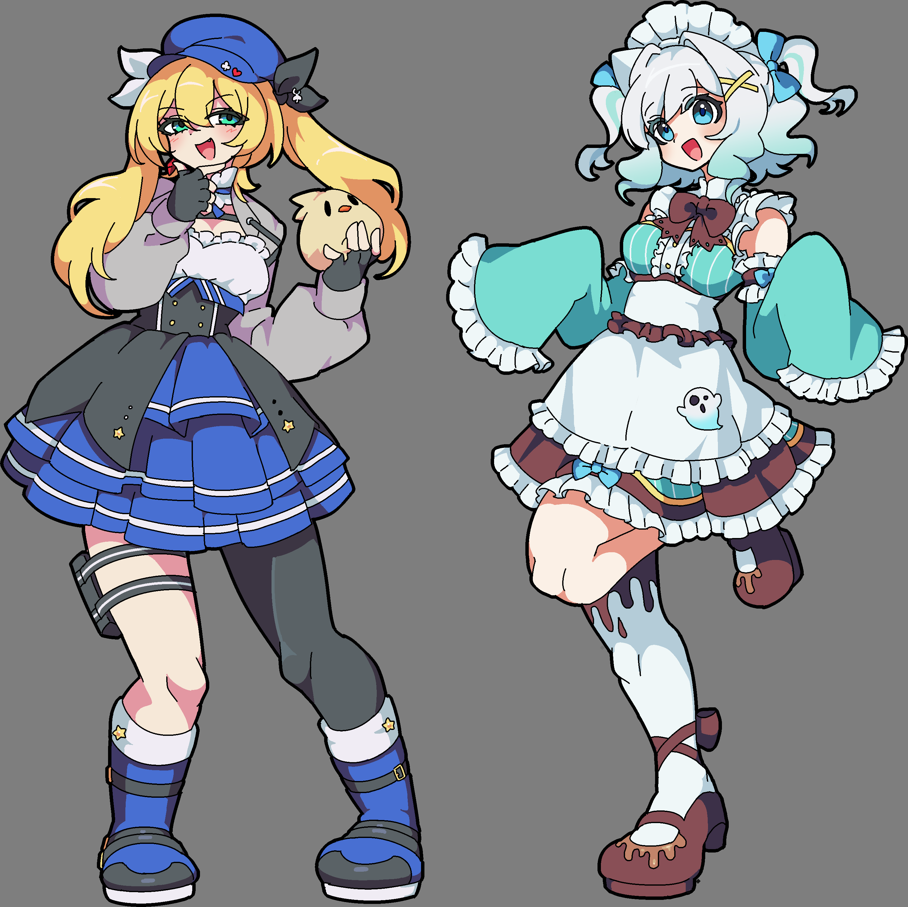 2girls absurdres blonde_hair blue_boots blue_hat boots commission dokibird dokibird_(retro_doki) dress fingerless_gloves gloves gradient_hair green_eyes green_sleeves hat highres indie_virtual_youtuber kekeken layered_dress maid maid_headdress mint_fantome mint_fantome_(minto_2.0) multicolored_hair multiple_girls single_leg_pantyhose sleeves_past_fingers sleeves_past_wrists triangular_headpiece twintails two_side_up virtual_youtuber white_headdress