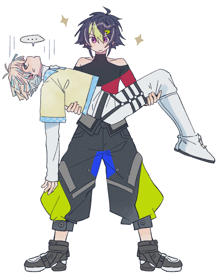 ... 2boys ahoge black_hair black_pants black_shirt black_shoes blonde_hair blue_eyes blue_hair blue_pants capri_pants carrying closed_mouth clothing_cutout collarbone collared_shirt commentary_request covered_collarbone creepyday frown green_hair green_pants grey_hair hair_between_eyes hair_ornament hairclip hibachi_mana hibachi_mana_(1st_costume) inami_rai inami_rai_(1st_costume) layered_sleeves long_sleeves looking_at_viewer male_focus multicolored_eyes multicolored_hair multicolored_pants multicolored_shoes multiple_boys nijisanji pants princess_carry purple_eyes red_shirt shirt shoes short_hair short_over_long_sleeves short_sleeves shoulder_cutout sidelocks simple_background speech_bubble spoken_ellipsis standing streaked_hair sweatdrop two-tone_shirt two-tone_shoes v-shaped_eyebrows virtual_youtuber white_background white_pants white_shirt white_shoes yellow_eyes yellow_shirt