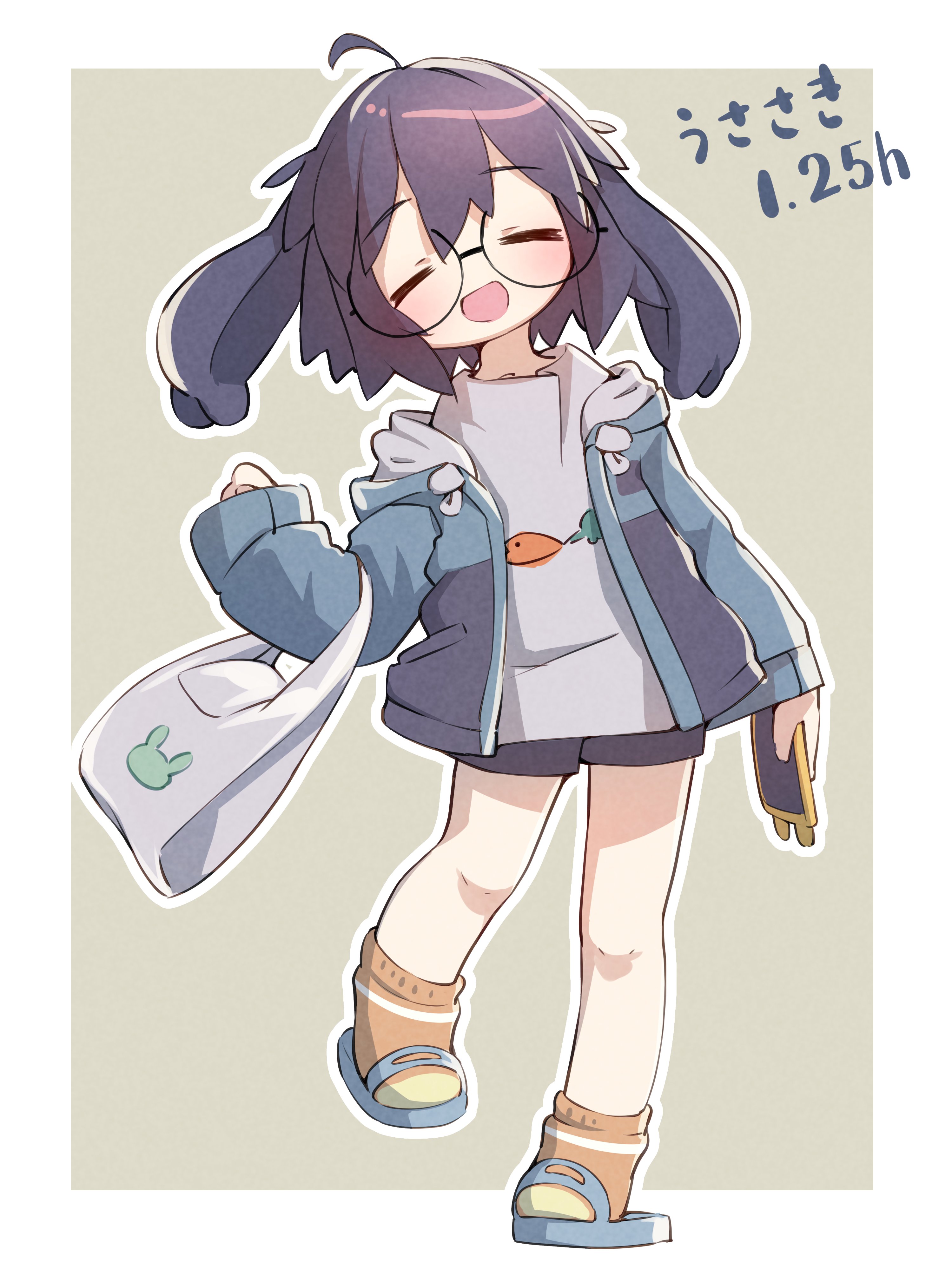 1girl :d =_= absurdres ahoge animal_ears bag black-framed_eyewear black_hair black_shorts blue_jacket blue_shoes blush border borrowed_character brown_socks carrot cellphone closed_eyes drawstring facing_viewer fang full_body glasses grey_background grey_shirt hair_between_eyes hand_up head_tilt highres holding holding_bag holding_phone hood hood_down hooded_jacket hoodie jacket long_sleeves lop_rabbit_ears off_shoulder open_clothes open_hoodie open_jacket open_mouth orange_socks outline phone plastic_bag print_shirt purple_hair rabbit_ears round_eyewear sandals semi-rimless_eyewear shirt shoes shopping_bag short_hair short_shorts shorts simple_background six_box sleeves_past_wrists slippers smartphone smile socks solo standing standing_on_one_leg striped_clothes thick_eyebrows two-tone_background usasaki_(vrchat) vrchat white_background white_border white_outline white_shirt