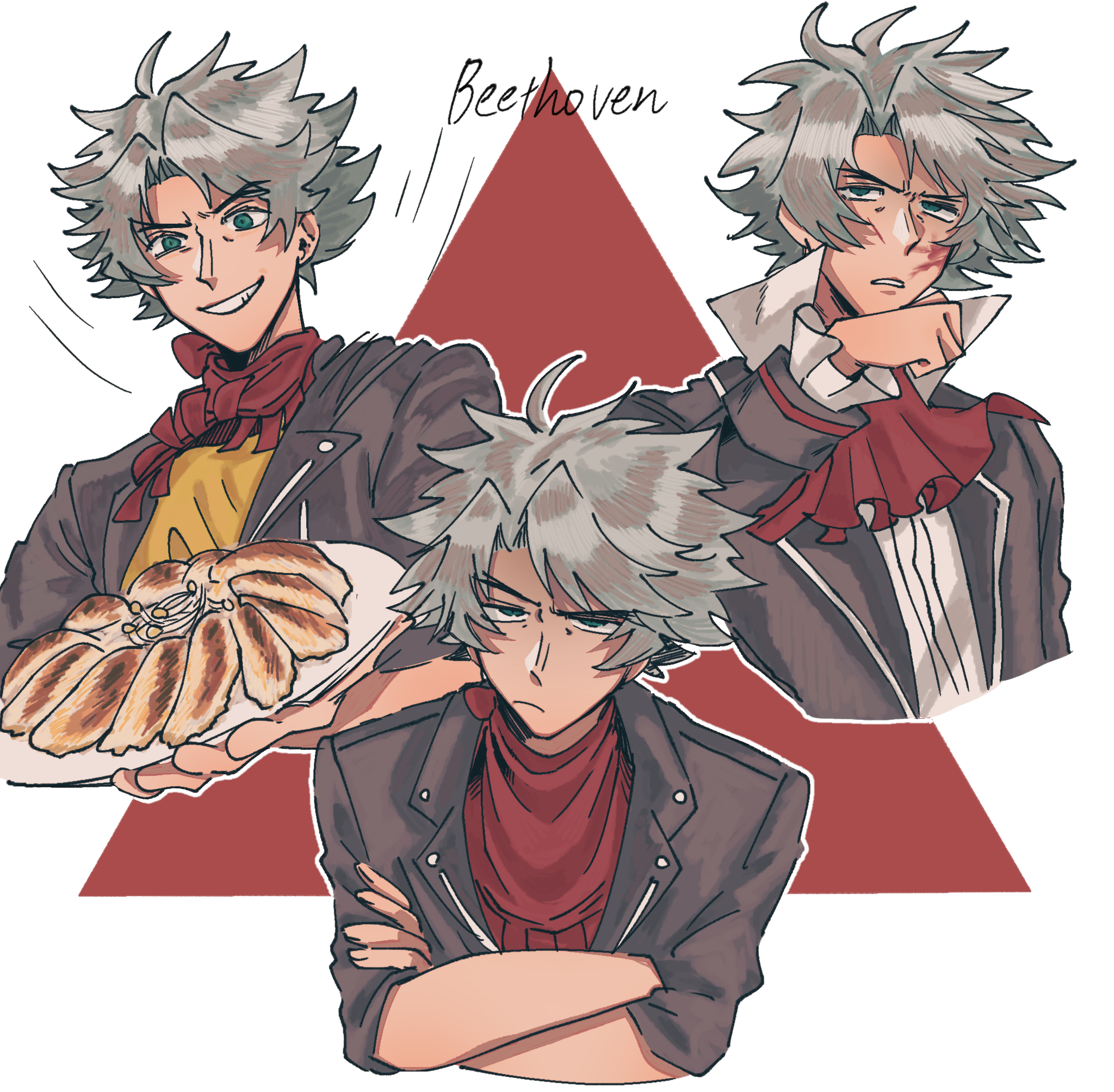 1boy ascot black_jacket blood blood_on_face character_name classicaloid closed_mouth crossed_arms dumpling food green_eyes grey_hair grin hanpa_(user_cspa4528) highres holding holding_plate jacket jiaozi ludwig_van_beethoven_(classicaloid) male_focus multiple_views plate red_ascot shirt smile unamused wiping_blood yellow_shirt