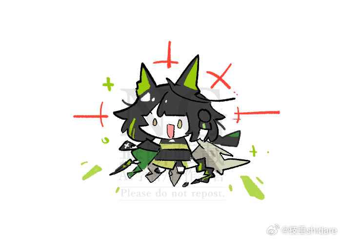 1girl :d arknights artist_name black_hair chibi green_eyes green_hair looking_at_viewer mon3tr_(arknights) multicolored_hair open_mouth shidare_(youh4016) simple_background smile solo streaked_hair watermark white_background