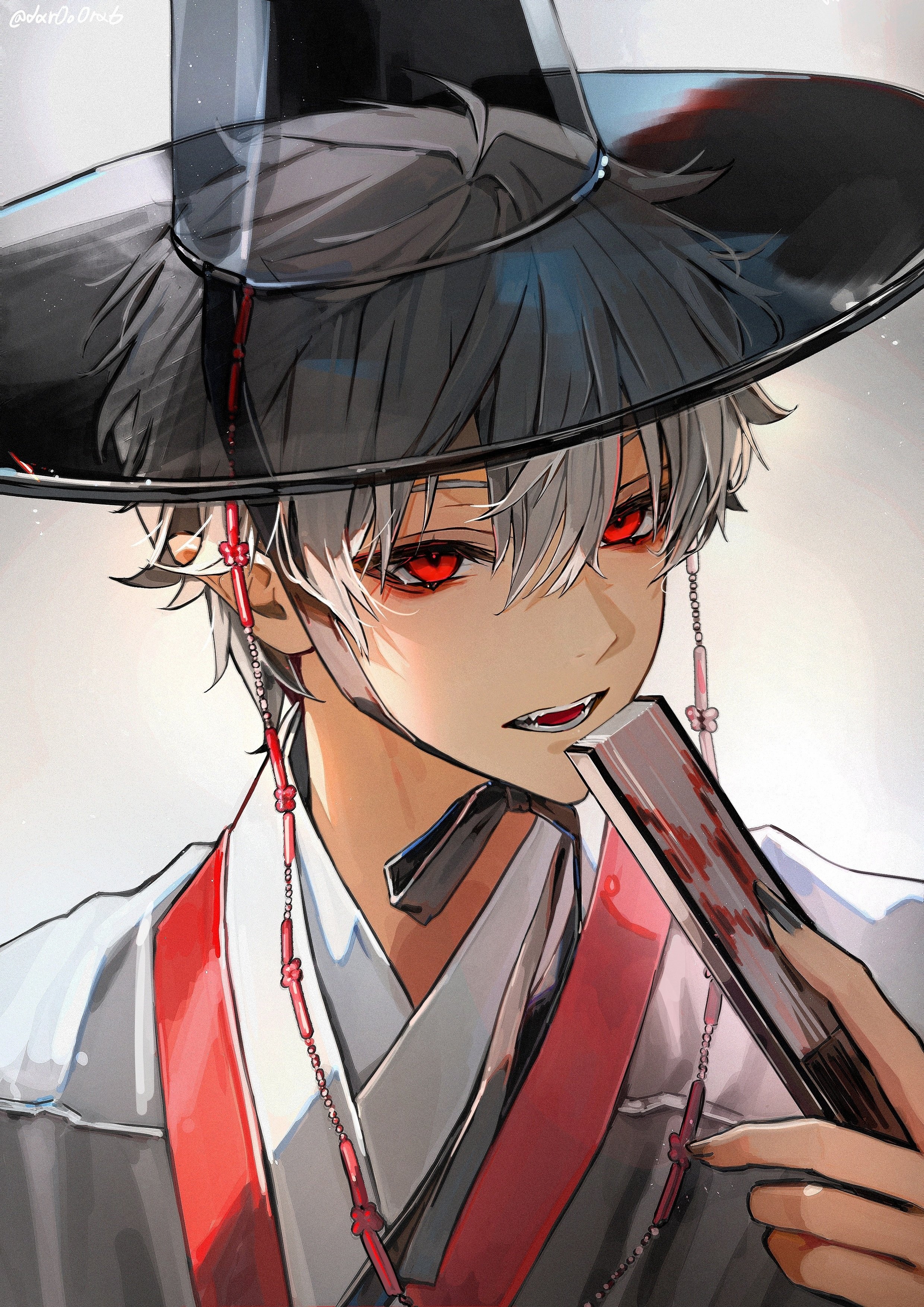 absurdres black_hat daro_(dar0o0rab) eyelashes fingernails folding_fan gat_(hat) grey_background hair_between_eyes hanbok hand_fan hat highres holding holding_fan korean_clothes kuzuha_(nijisanji) looking_at_viewer nijisanji red_eyes short_hair simple_background upper_body vampire virtual_youtuber white_hair