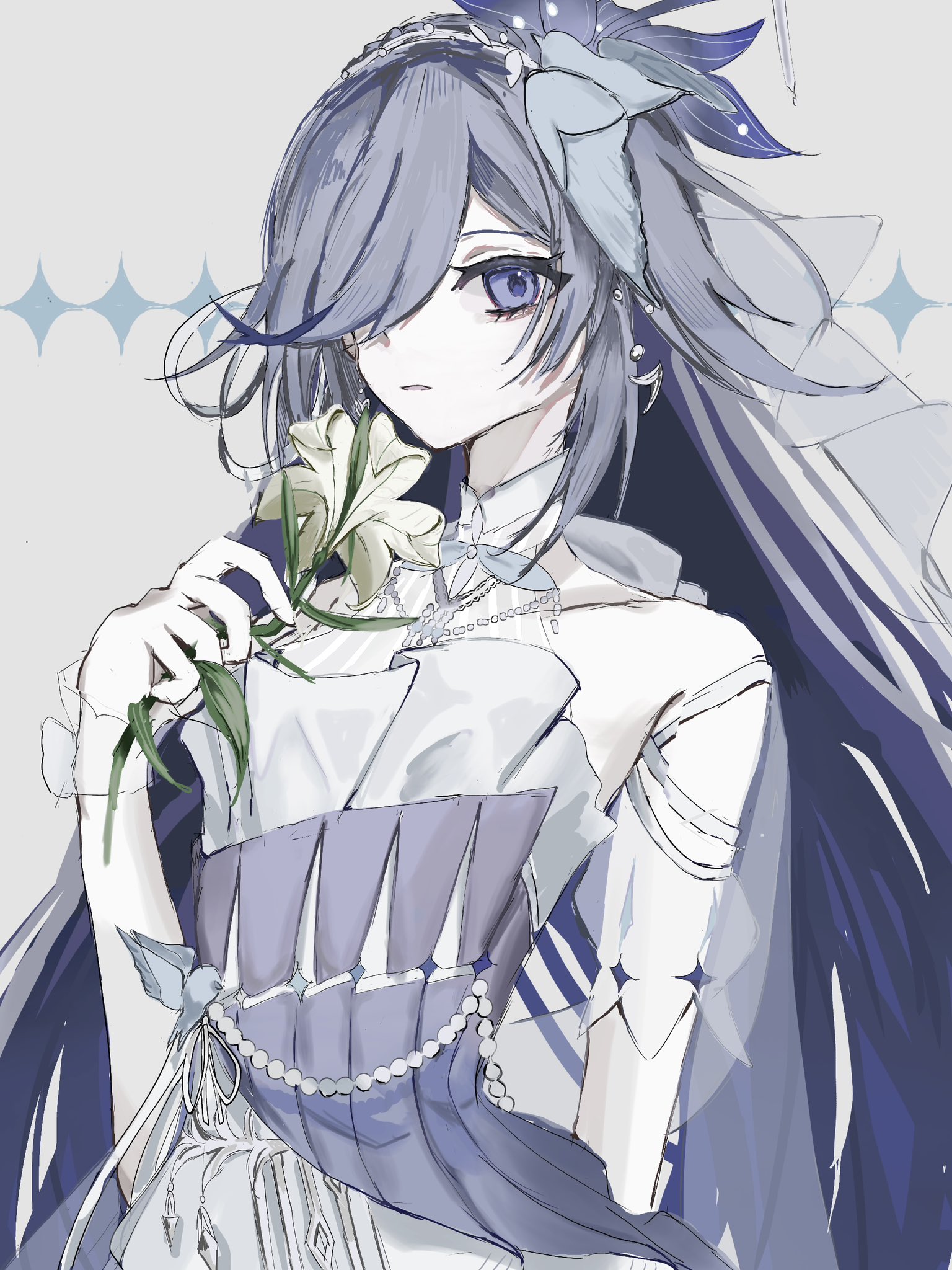 1girl bare_shoulders bird_hair_ornament blue_eyes closed_mouth dress flower fu_hua fu_hua_(azure_empyrea) fu_hua_(cerulean_court) grey_dress grey_hair hair_ornament hair_over_one_eye halter_dress halterneck highres holding holding_flower honkai_(series) honkai_impact_3rd long_hair solo une_xx very_long_hair wedding_dress white_flower