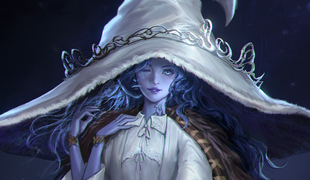 1girl blonde_hair blue_eyes blue_skin brown_cape cape colored_skin dlx_(kssksskssk) elden_ring extra_arms hat long_hair one_eye_closed purple_lips ranni_the_witch shirt upper_body white_hat white_shirt witch_hat