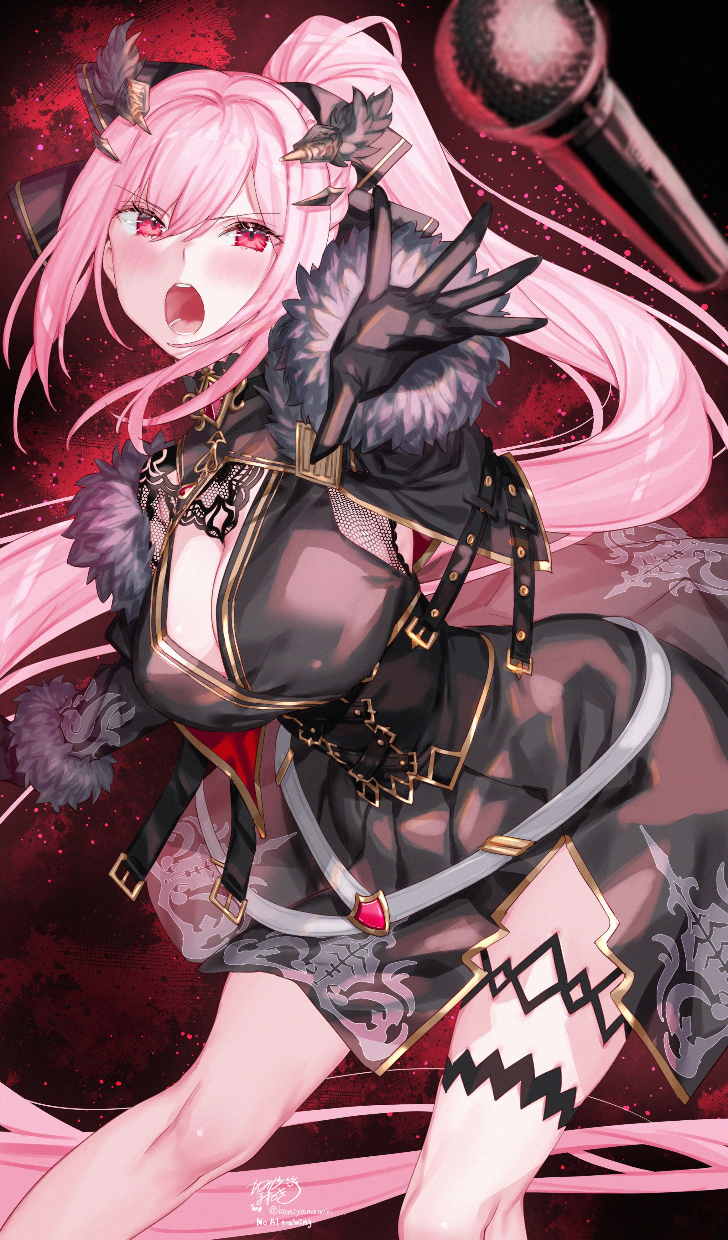 1girl absurdres black_corset black_dress black_gloves black_jacket black_ribbon breasts cleavage_cutout clothing_cutout commentary contrapposto corset cropped_jacket dress english_commentary fur-trimmed_jacket fur_trim gloves gold_trim hair_ribbon headpiece high_ponytail highres hololive hololive_english jacket kamiya_maneki large_breasts long_hair microphone mori_calliope mori_calliope_(grimoire) official_alternate_costume official_alternate_hairstyle open_mouth outstretched_arm pink_eyes pink_hair ponytail reaching ribbon short_dress side_slit solo swept_bangs thigh_strap v-shaped_eyebrows very_long_hair virtual_youtuber