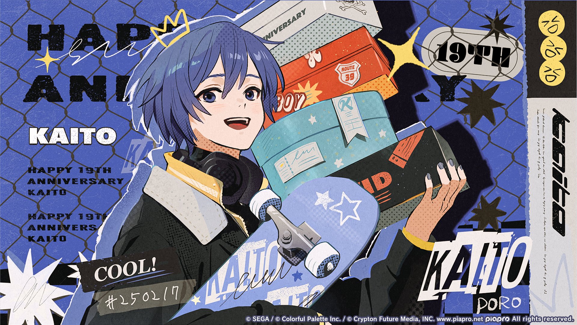 1boy :d anniversary artist_name black_shirt blue_eyes blue_hair box character_name commentary_request copyright_notice crown dated emoji happy_anniversary hashtag headphones headphones_around_neck highres holding holding_box holding_skateboard kaito_(vocaloid) male_focus official_art open_mouth poro_(apom6n) project_sekai shirt skateboard smile solo star_(symbol) teeth tongue upper_teeth_only vocaloid