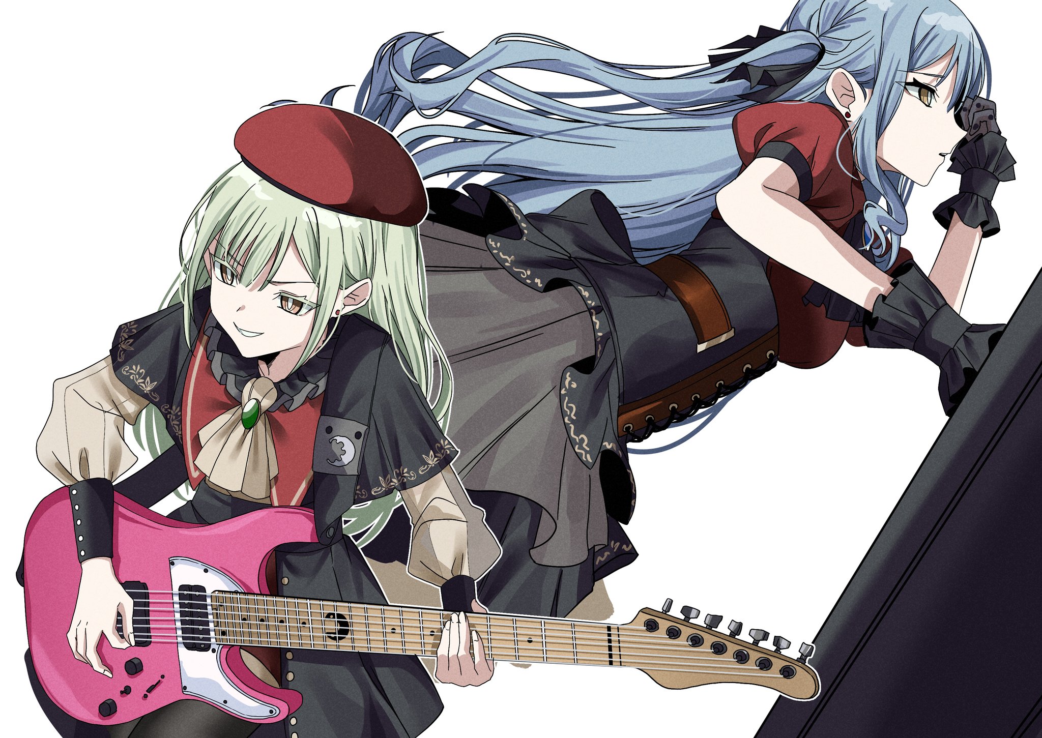 2girls ascot bang_dream! bang_dream!_it's_mygo!!!!! beret black_ascot black_capelet black_collar black_corset black_gloves black_pantyhose black_ribbon black_skirt blue_hair braid brooch capelet clenched_hand closed_mouth collar colored_eyelashes commentary corset cropped_legs cross-laced_clothes cross-laced_corset ear_piercing fingernails frilled_collar frilled_wrist_cuffs frills gloves gold_trim green_hair grin guitar guitar_strap hair_between_eyes hand_over_face hand_up hat highres holding holding_another's_hair holding_guitar holding_instrument instrument jewelry keyboard_(instrument) layered_skirt long_hair long_sleeves mortis_(bang_dream!) mortis_(costume)_(bang_dream!) multiple_girls music no_mask oblivionis_(bang_dream!) outline pantyhose pantyhose_under_shorts parted_lips piercing playing_guitar playing_instrument pleated_skirt pokarii_zuu profile puffy_short_sleeves puffy_sleeves red_capelet red_hat red_shirt red_shorts ribbon ribbon_hair see-through_clothes see-through_gloves see-through_sleeves shirt short_sleeves shorts side_braids sidelocks simple_background single_stripe skirt smile striped_capelet swept_bangs untranslatable_commentary togawa_sakiko two_side_up upper_body v-shaped_eyebrows very_long_hair wakaba_mutsumi white_background white_outline wrist_cuffs yellow_ascot yellow_eyes