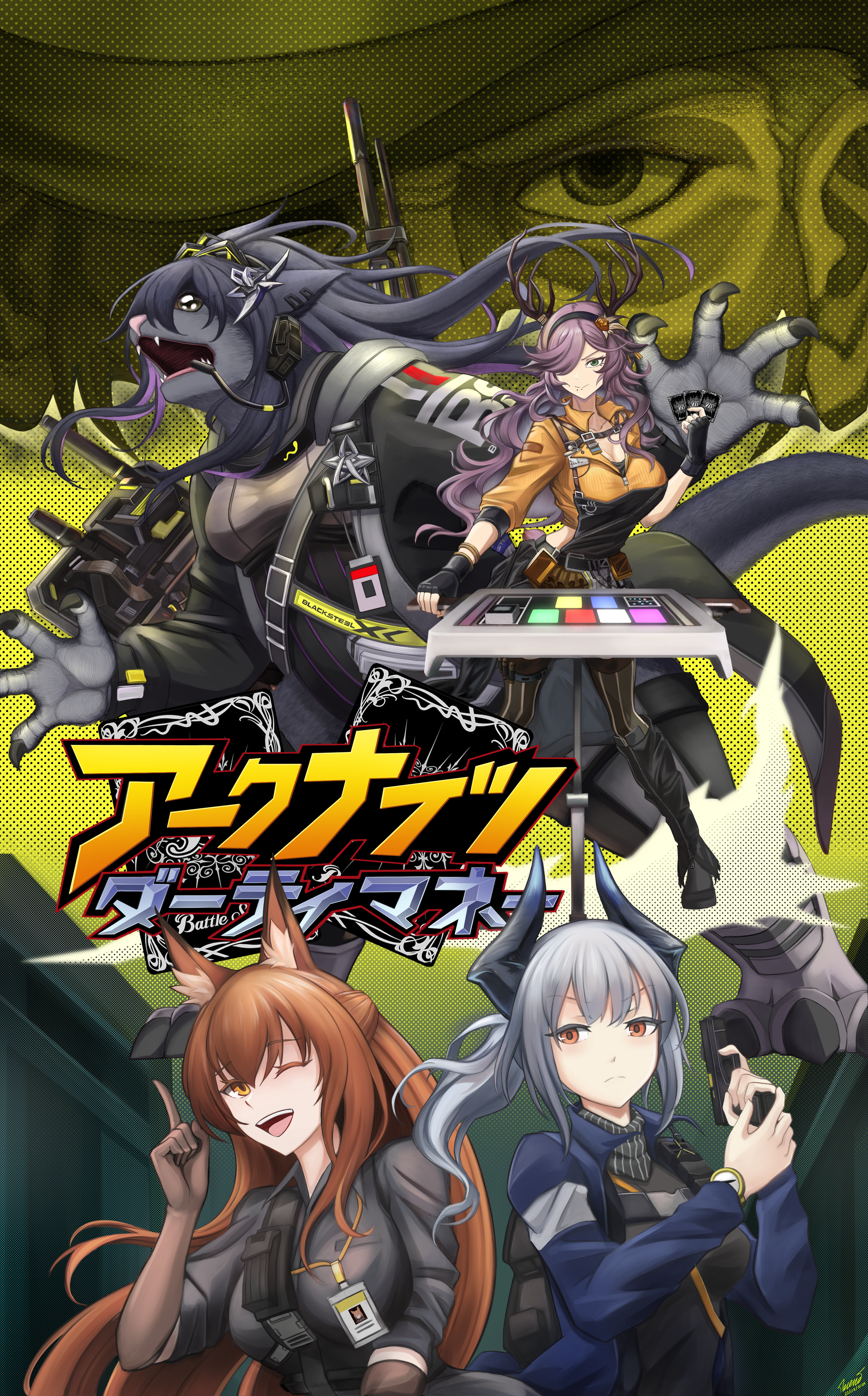 4girls absurdres arknights battle_spirits boots brown_hair card claws coldshot_(arknights) deer_girl elbow_gloves franka_(arknights) gloves green_eyes gun highres holding holding_card holding_gun holding_weapon horns id_card jessica_(arknights) liskarm_(arknights) multiple_girls punnosalt purple_hair shirt smile wavy_hair weapon yellow_shirt