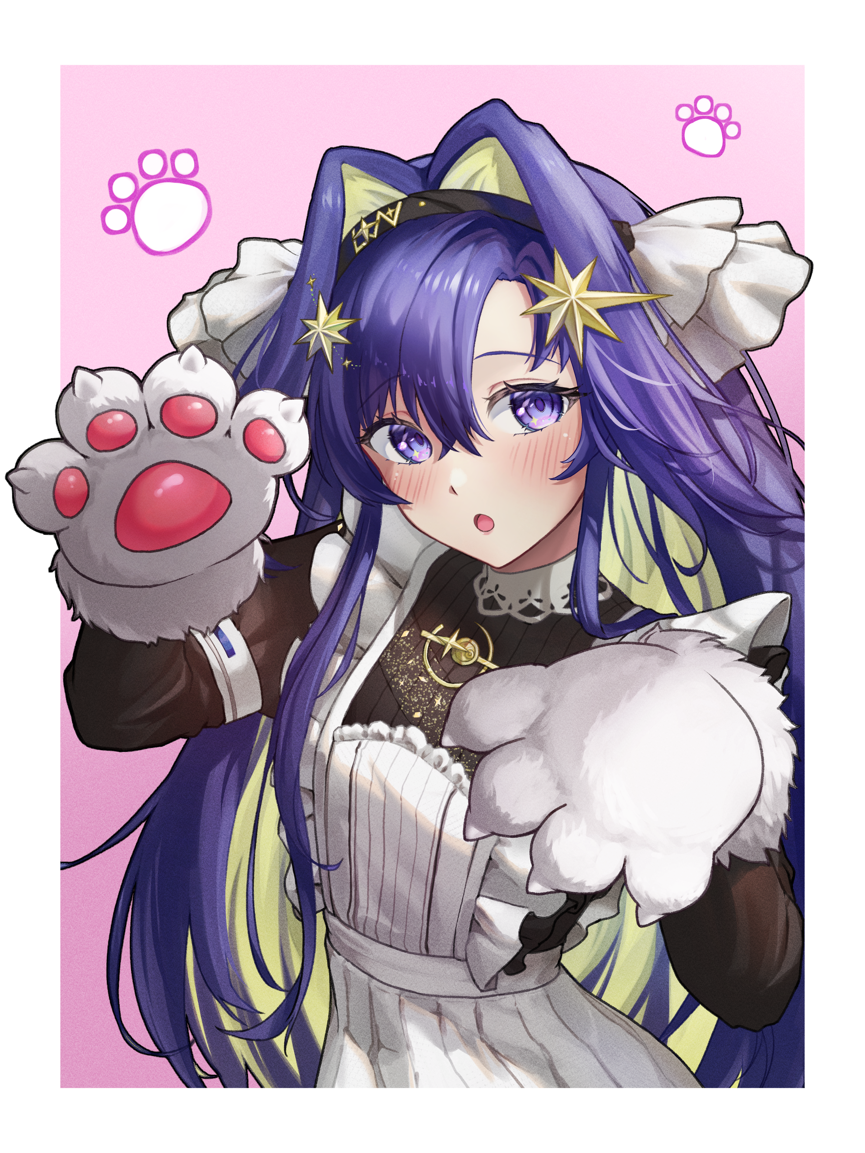 1girl :o absurdres animal_hands apron black_dress black_hairband blonde_hair blue_eyes blue_hair blush border colored_inner_hair dress frilled_apron frills gloves hair_intakes hair_ornament hairband hands_up heonu highres long_hair looking_at_viewer multicolored_hair outside_border paw_gloves paw_print pink_background reverse:1999 school_uniform solo soviet_school_uniform star_(symbol) star_hair_ornament upper_body very_long_hair voyager_(reverse:1999) white_apron white_border white_gloves