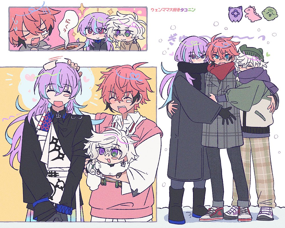 3boys :3 :d ^_^ ahoge akagi_wen akagi_wen_(1st_costume) bandaid bandaid_on_cheek bandaid_on_face beanie black_boots black_coat black_gloves black_hair black_pants black_scarf black_shirt blue_eyes blue_hair blue_pants blush boots braid brown_pants brown_sweater closed_eyes closed_mouth coat collared_shirt cooking_pot covered_mouth creepyday crossed_bangs earrings fang food fur_scarf gloves green_eyes green_hat green_jacket grey_eyes grey_jacket grey_shoes group_hug hair_between_eyes hanafuda_earrings hand_on_another's_head hand_up hat headpat heart holding holding_cooking_pot holding_spoon hoshirube_sho hoshirube_sho_(1st_costume) hug jacket jewelry long_hair long_sleeves looking_at_viewer male_focus mini_person miniboy multicolored_eyes multicolored_hair multiple_boys multiple_views murakumo_kagetsu murakumo_kagetsu_(1st_costume) nijisanji open_mouth pants pink_hair pink_sweater_vest plaid_clothes plaid_pants puffy_long_sleeves puffy_sleeves purple_eyes purple_hair purple_scarf red_scarf scarf scarf_over_mouth sharp_teeth shirt shoes short_hair short_sleeves side_braid single_braid smile sneakers snow snowing spoon standing streaked_hair sweater sweater_vest teeth translation_request upper_teeth_only vest virtual_youtuber white_hair white_jacket white_shirt white_shoes white_vest wide_sleeves wing_collar