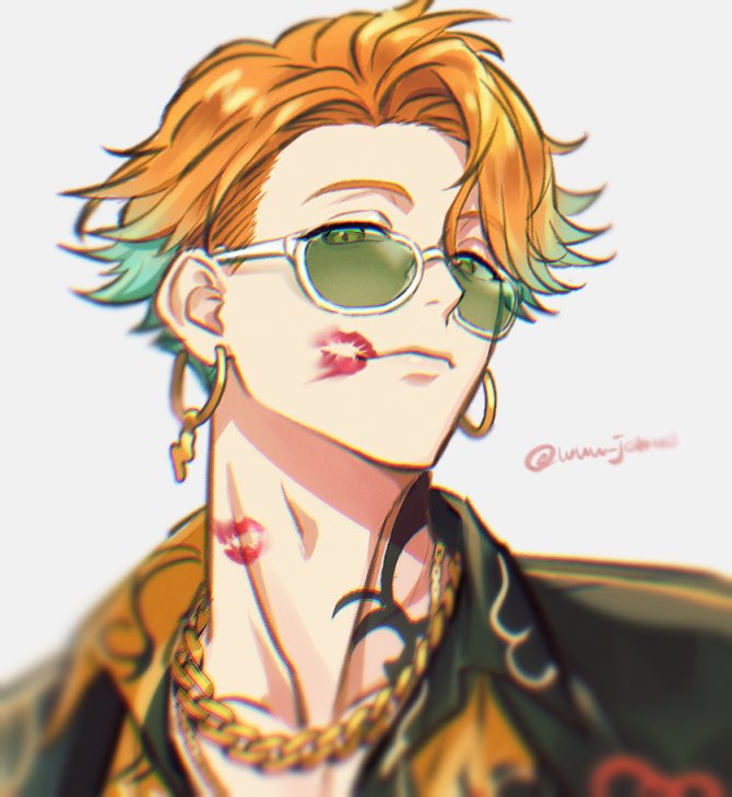 1boy aqua_eyes aqua_hair artist_name black_haori black_shirt chain chain_necklace closed_mouth collarbone collared_shirt commentary_request earrings gold_earrings gold_necklace gradient_hair haori haori_on_shoulders hoop_earrings japanese_clothes jewelry lipstick_mark lipstick_mark_on_face lipstick_mark_on_neck looking_at_viewer male_focus multicolored_eyes multicolored_hair multicolored_shirt neck_tattoo necklace nijisanji official_alternate_costume orange_eyes orange_hair orange_shirt parted_bangs shirt short_hair simple_background solo sunglasses tattoo twitter_username upper_body usami_rito usami_rito_(2nd_costume) virtual_youtuber white-framed_eyewear white_background www_jamuo
