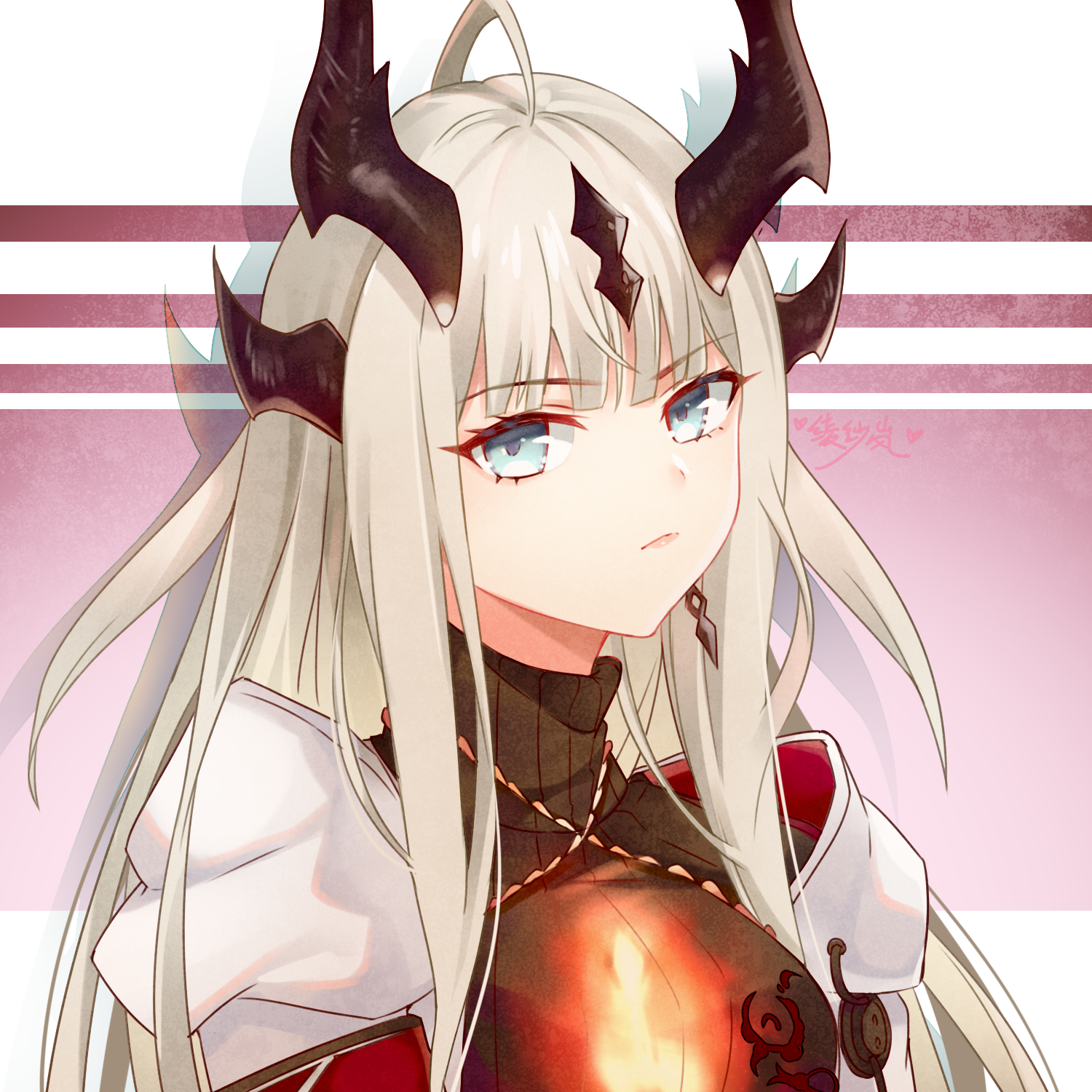 1girl aqua_eyes arknights black_horns black_sweater blonde_hair chinese_commentary closed_mouth commentary_request fire highres horns light_frown lingshalan long_hair partial_commentary portrait reed_(arknights) reed_the_flame_shadow_(arknights) ribbed_sweater shadow solo sweater turtleneck turtleneck_sweater