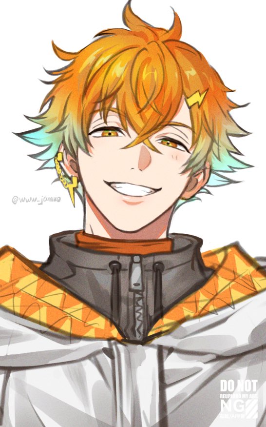 1boy aqua_hair artist_name commentary_request crossed_bangs drawstring earrings gradient_hair grey_jacket grin hair_between_eyes hair_ornament hood hood_down hooded_jacket jacket jewelry lightning_bolt lightning_bolt_earrings lightning_bolt_hair_ornament lightning_bolt_symbol looking_at_viewer male_focus multicolored_hair nijisanji orange_eyes orange_hair orange_shirt shirt short_hair simple_background single_earring smile solo teeth turtleneck twitter_username upper_body usami_rito usami_rito_(1st_costume) virtual_youtuber white_background white_jacket www_jamuo zipper zipper_pull_tab