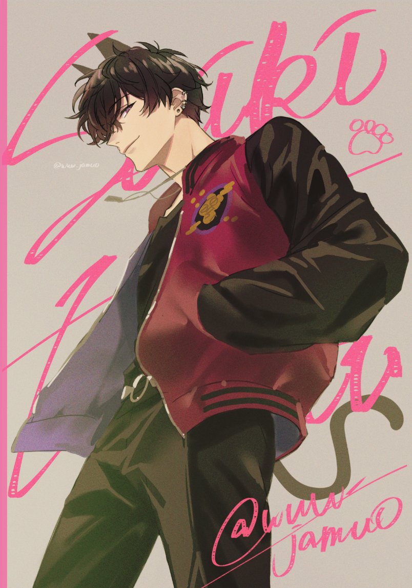 1boy artist_name black_hair black_jacket black_pants black_shirt black_sleeves character_name closed_mouth commentary_request crossed_bangs drawn_ears drawn_tail ear_piercing earrings from_below grey_background hair_between_eyes hands_in_pockets jacket jewelry letterman_jacket long_sleeves looking_at_viewer male_focus necklace nijisanji open_clothes open_jacket pants paw_earrings paw_print piercing purple_eyes red_jacket saiki_ittetsu shirt short_hair sideways_glance signature simple_background smile solo standing twitter_username virtual_youtuber www_jamuo