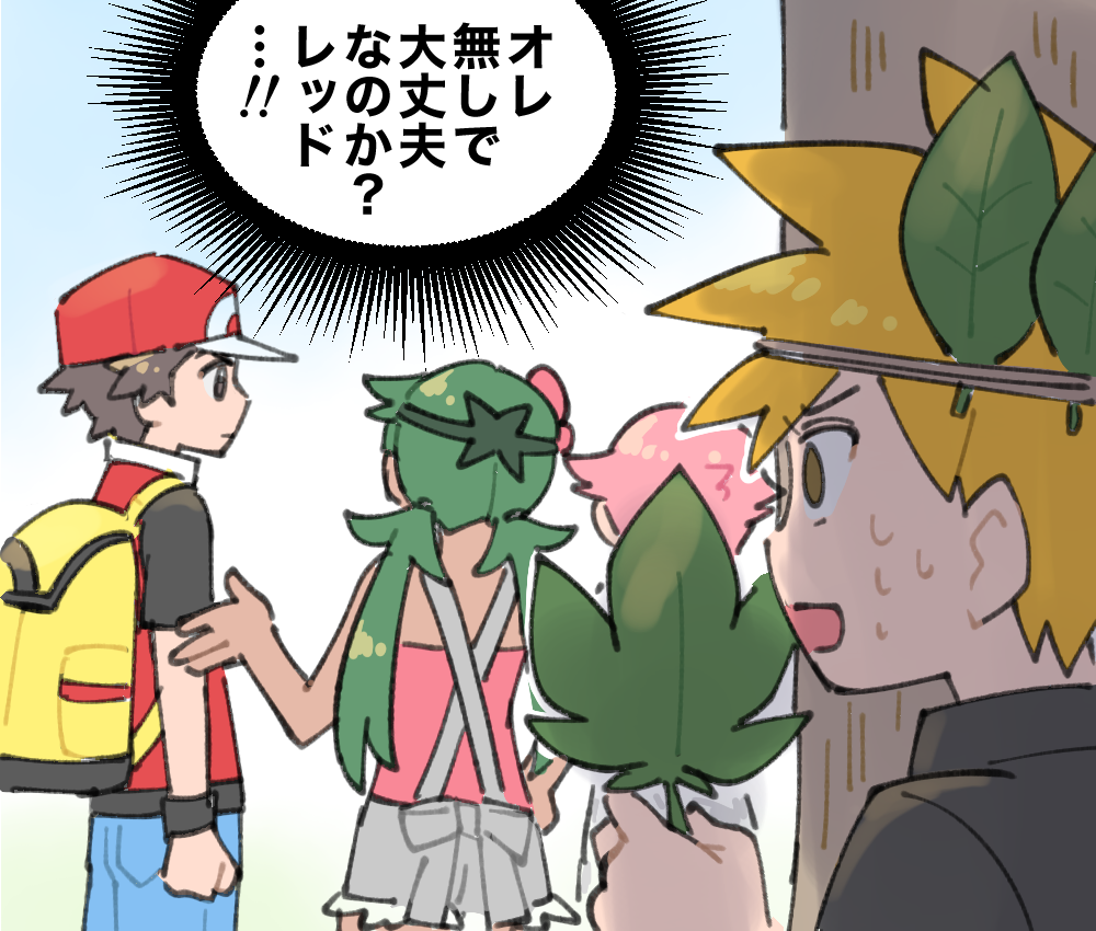 2boys 2girls backpack bad_tag bag blue_oak blue_pants brown_eyes brown_hair commentary_request denim flower green_hair grey_shorts hair_flower hair_ornament holding holding_leaf jacket jeans leaf low_twintails mallow_(pokemon) maylene_(pokemon) meme meme_request multiple_boys multiple_girls netorare nintendo orange_hair pants peeking_out pink_hair pokemon pokemon_dppt pokemon_frlg pokemon_sm pumpkinpan red_(pokemon) red_jacket short_hair short_shorts shorts time_paradox translation_request twintails very_short_hair wristband