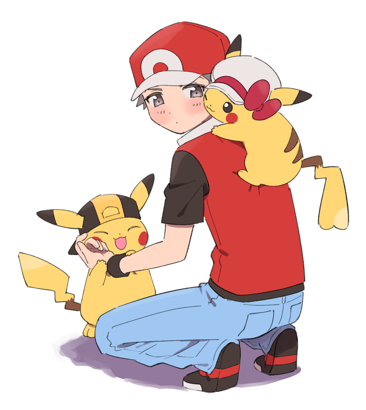 1boy backwards_hat blue_pants bow brown_eyes brown_hair closed_eyes commentary_request cosplay denim ethan_(pokemon) ethan_(pokemon)_(cosplay) gen_1_pokemon hat hat_bow highres jacket jeans lyra_(pokemon) lyra_(pokemon)_(cosplay) male_focus nintendo open_mouth pants pikachu pokemon pokemon_(creature) pokemon_heartgold_and_soulsilver pokemon_on_back pumpkinpan red_hat red_jacket smile squatting white_hat wristband