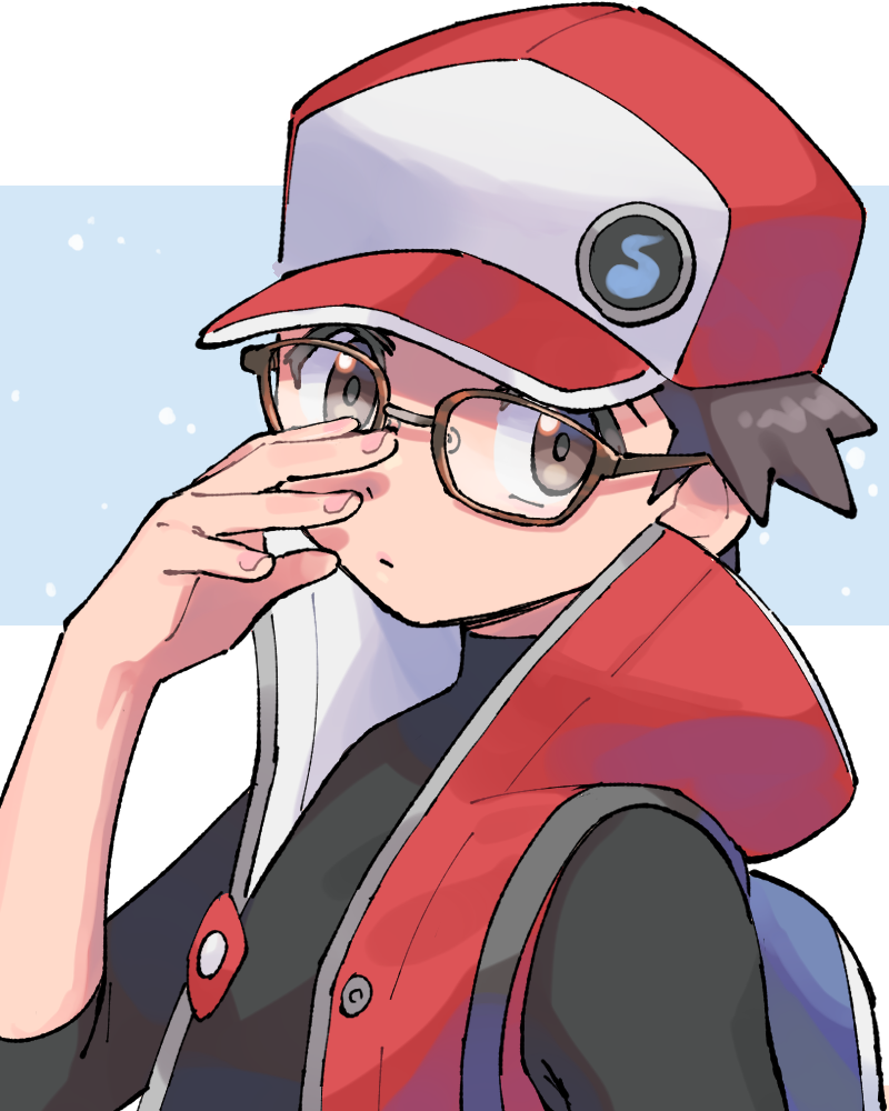 1boy adjusting_eyewear backpack bag bespectacled brown_eyes brown_hair commentary_request glasses hat male_focus nintendo pokemon pokemon_masters_ex pumpkinpan red_(pokemon) red_(sygna_suit)_(pokemon) red_hat red_vest snowing solo turtleneck upper_body vest