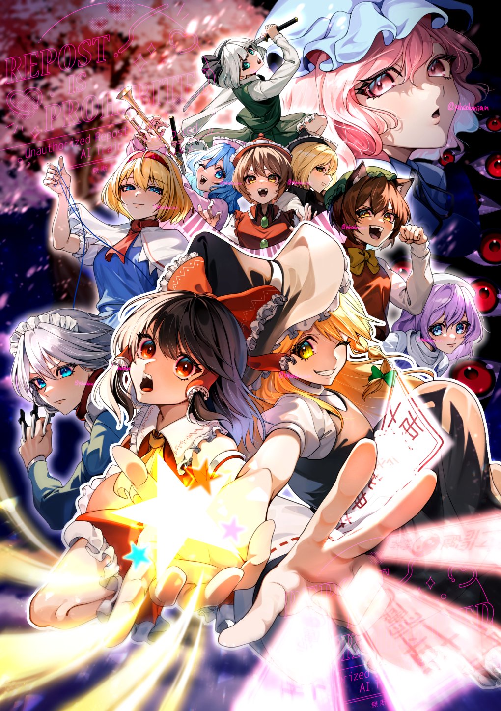 6+girls alice_margatroid blonde_hair blue_dress blue_eyes blue_hair brown_hair chen cherry_blossoms dress gap_(touhou) green_eyes hakurei_reimu hat highres holding holding_knife izayoi_sakuya kirisame_marisa knife konpaku_youmu letty_whiterock long_hair lunasa_prismriver lyrica_prismriver medium_hair merlin_prismriver multiple_girls ofuda perfect_cherry_blossom pink_eyes pink_hair red_eyes saigyouji_yuyuko shirt short_hair skirt touhou vest watermark white_hair white_shirt yahedanian yellow_eyes
