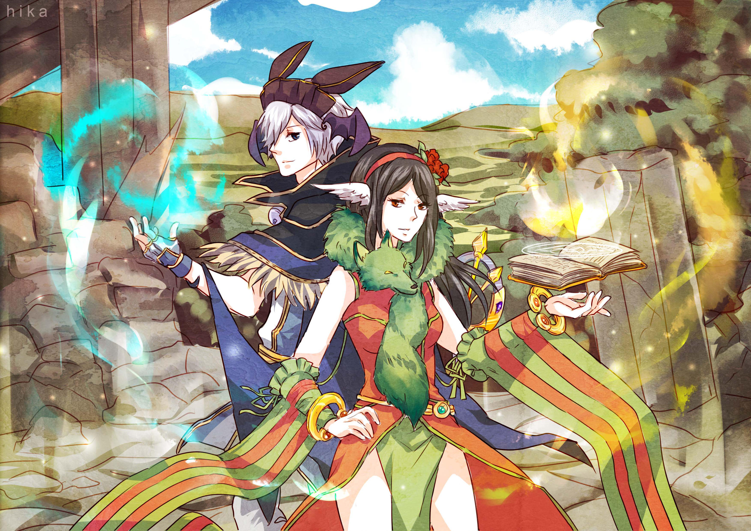 1boy 1girl animal animal_around_neck bat_wings black_choker black_hair blue_eyes blue_gloves blue_sky book breasts bush capelet champourado choker closed_mouth cloud commentary cowboy_shot detached_sleeves dress english_commentary fingerless_gloves fire fox fur-trimmed_capelet fur_trim gloves green_sleeves grey_hair hair_over_one_eye hairband head_wings headdress high_collar high_wizard_(ragnarok_online) highres holding holding_book long_hair looking_at_viewer magic medium_breasts outdoors pelvic_curtain professor_(ragnarok_online) purple_wings pyrokinesis ragnarok_online red_dress red_eyes red_hairband red_sleeves ruins short_hair sky sleeveless sleeveless_dress smile striped_sleeves white_wings wings
