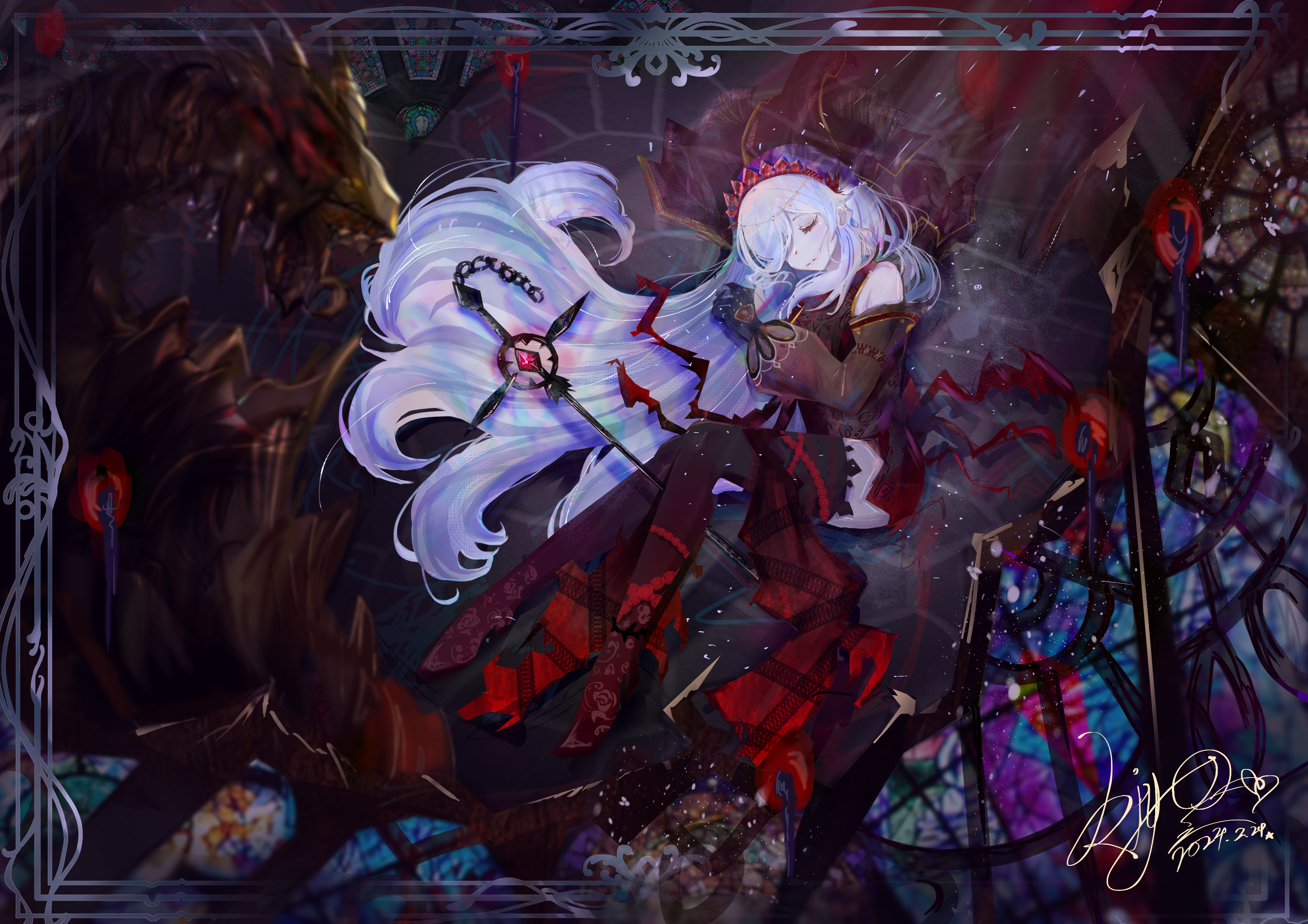 1girl absurdres bare_shoulders black_dress black_gloves black_sleeves black_thighhighs black_veil blazing_cartesia_the_virtuous chain chinese_commentary closed_eyes closed_mouth commentary_request cross dated detached_sleeves dot_nose dress ecclesia_(yu-gi-oh!) expressionless frilled_dress frilled_sleeves frills full_body gloves gradient_clothes gradient_dress gradient_thighhighs hair_spread_out hairband highres indoors kiyo_lexie leg_ribbon light_particles long_dress long_hair long_sleeves lying on_side pale_skin picture_frame pointy_ears red_dress red_hairband red_ribbon red_thighhighs ribbon ruins signature sleeping sleeveless sleeveless_dress solo staff stained_glass thighhighs veil very_long_hair wavy_hair white_hair yu-gi-oh!