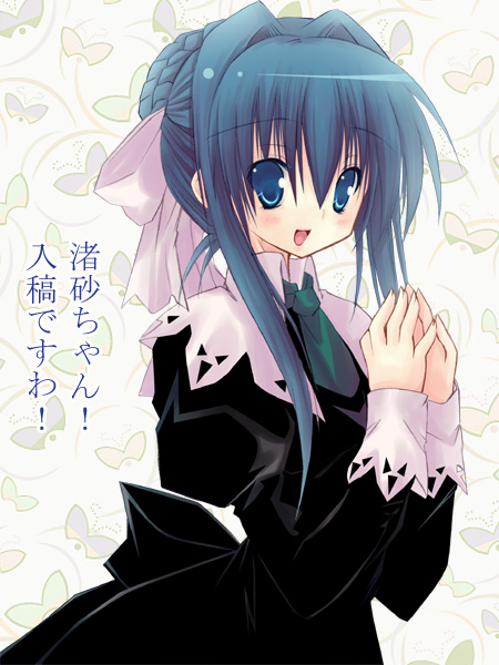 00s 1girl black_dress blue_eyes blue_hair blush bow braid dress female_focus gothic_lolita hair_bow hair_bun hair_ribbon lolita_fashion long_hair long_sleeves matching_hair/eyes necktie open_mouth ribbon school_uniform single_hair_bun smile solo strawberry_panic! suzumi_tamao translation_request
