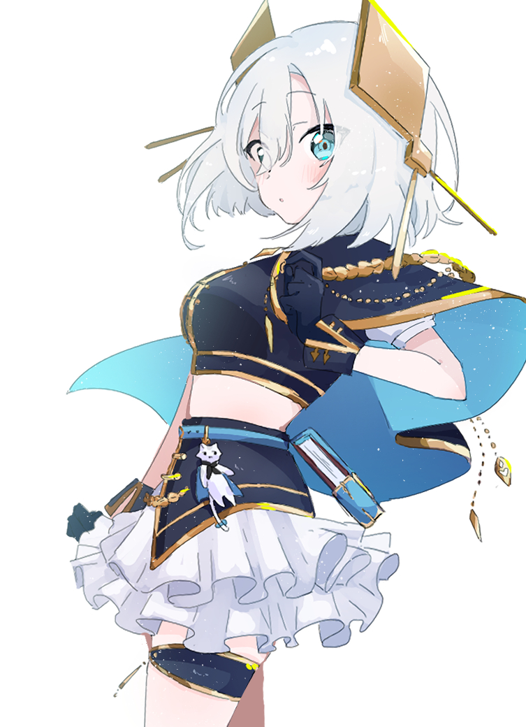 1girl ars_almal belt black_gloves blue_belt blush cloak cowboy_shot crop_top emi537469 frilled_skirt frills from_side gloves gold_trim green_eyes headgear looking_at_viewer nijisanji nijisanji_idol_uniform open_mouth short_sleeves simple_background skirt solo virtual_youtuber white_background white_hair
